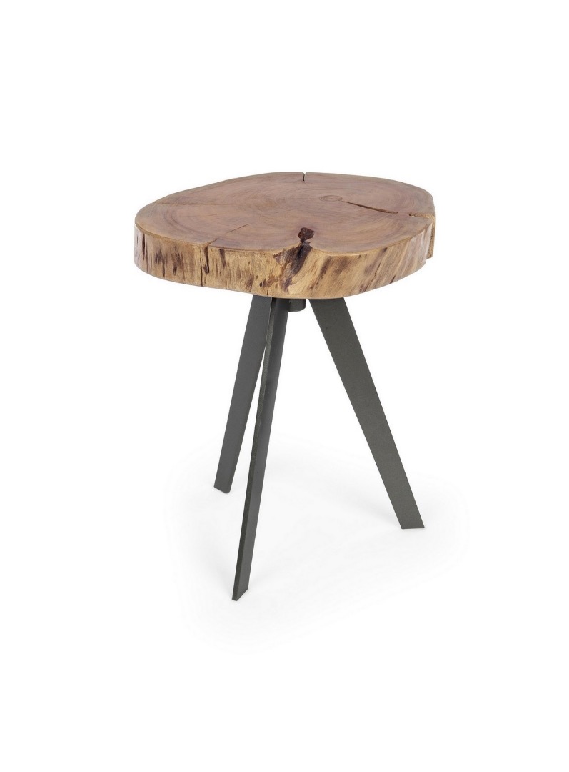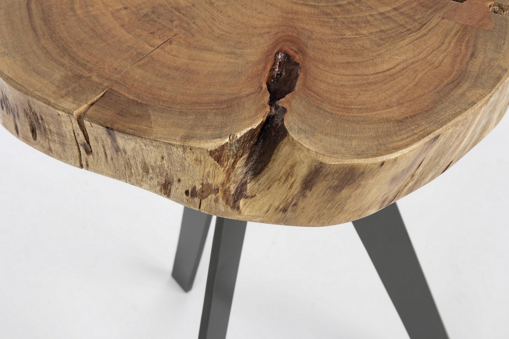 Vrch z akáciového dreva (pôvodné časti guľatiny), oceľové nohy s epoxidovým práškovým nástrekom.