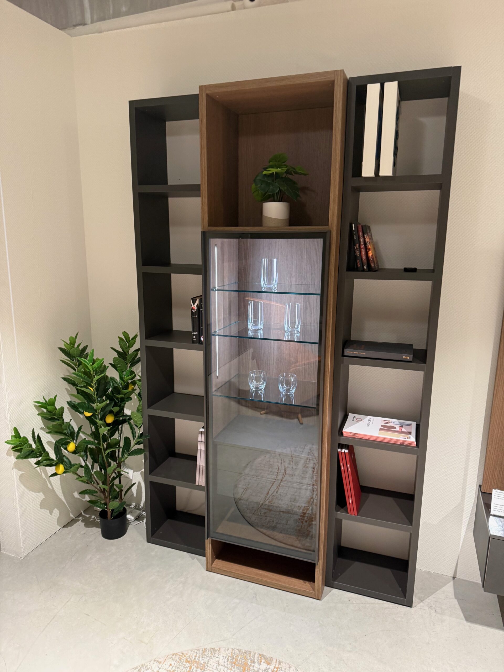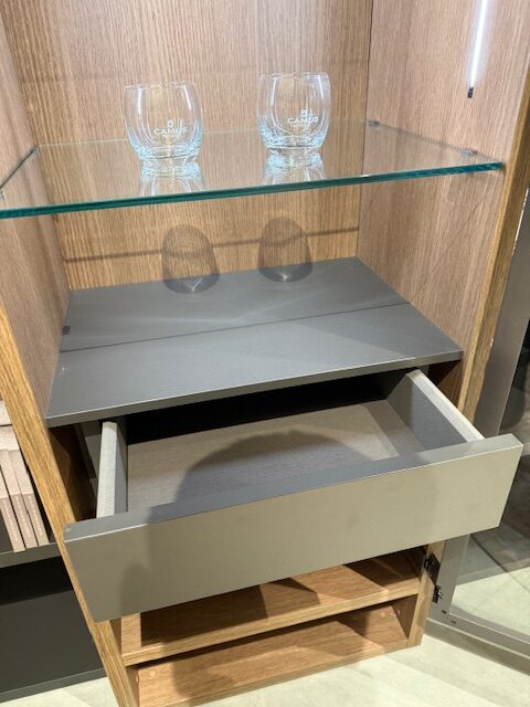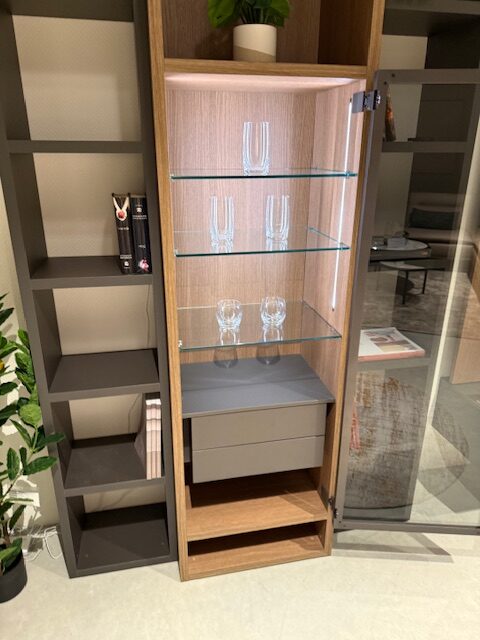 Pridať do sledovača cienElegantná knižnicová zostava so zabudovanou vitrínou. Vo vnútri vitríny sú 2 šuflíky na push otváranie. Osvetlenie je v cene s diaľkovým ovládačom. Police majú schované neviditeľné kovania.