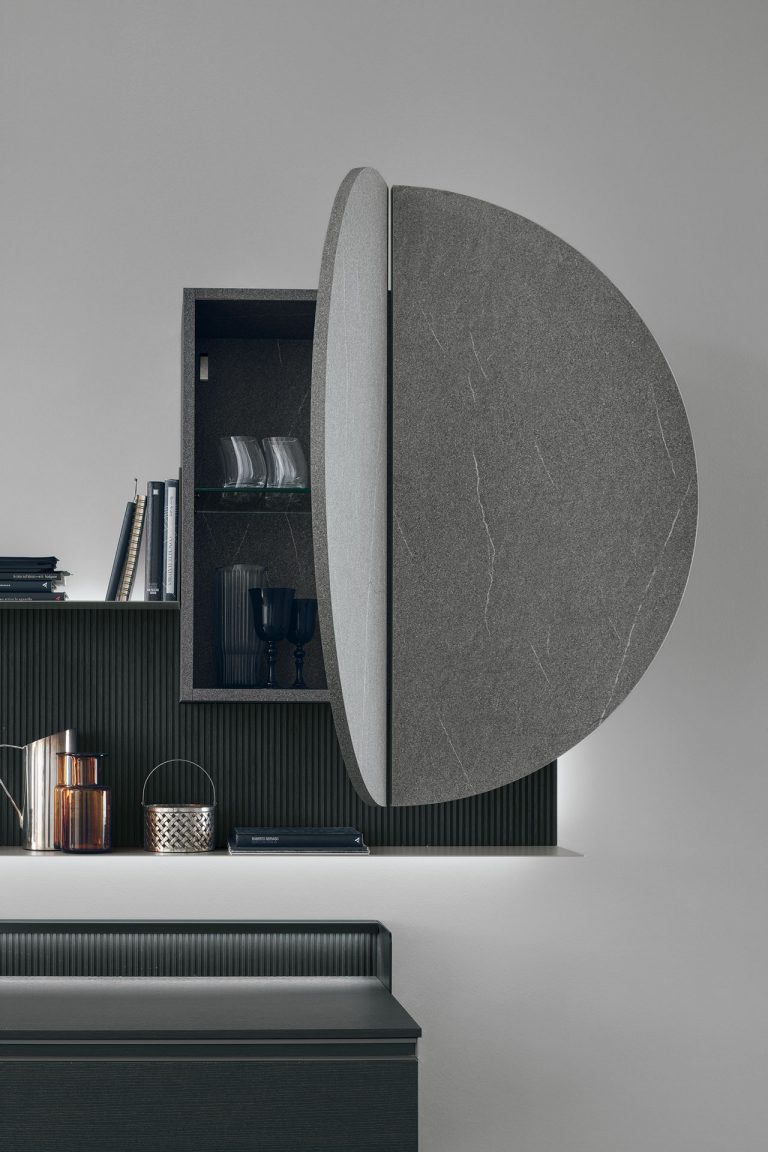 Za prednou časťou nástennej jednotky Dot sa nachádza užitočný úložný priestor. Obývacia izba je obohatená o nový funkčný a zároveň dekoratívny prvok, ktorý tvarom a materialitou tmavej úpravy Piasentina evokuje plnosť mesiaca.Katalóg prevedení nižšie.