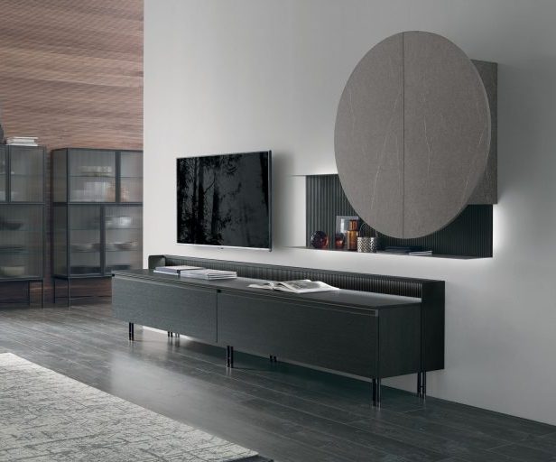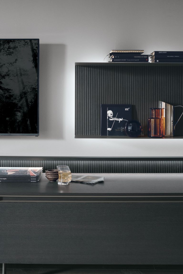 Zvýšené čielko od podnoží Scenario s kovovými policami sa vyznačujú dubovým drevom canettè charcoal. Rebrovaný efekt dreva sa vracia na plochách skriniek pre sofistikovanú obývačku v rôznych odtieňoch a kombinácii.