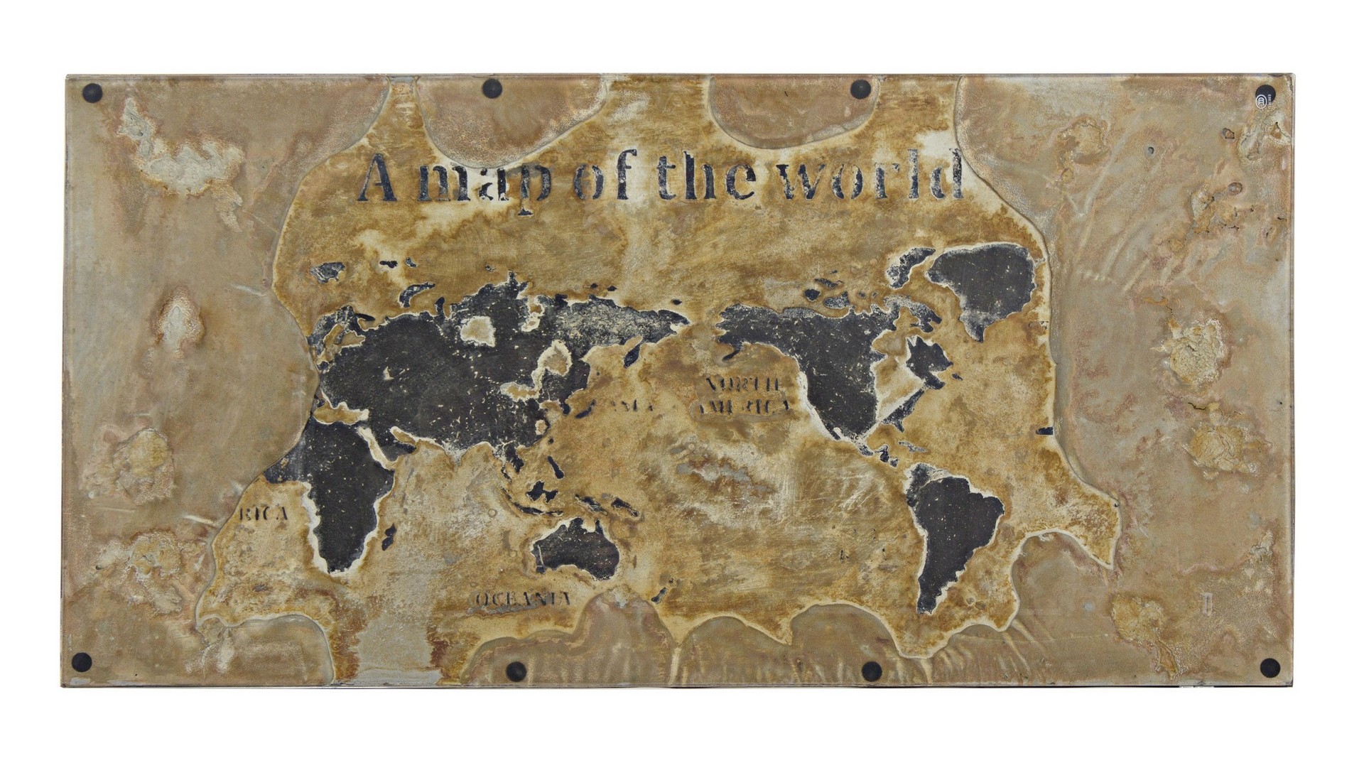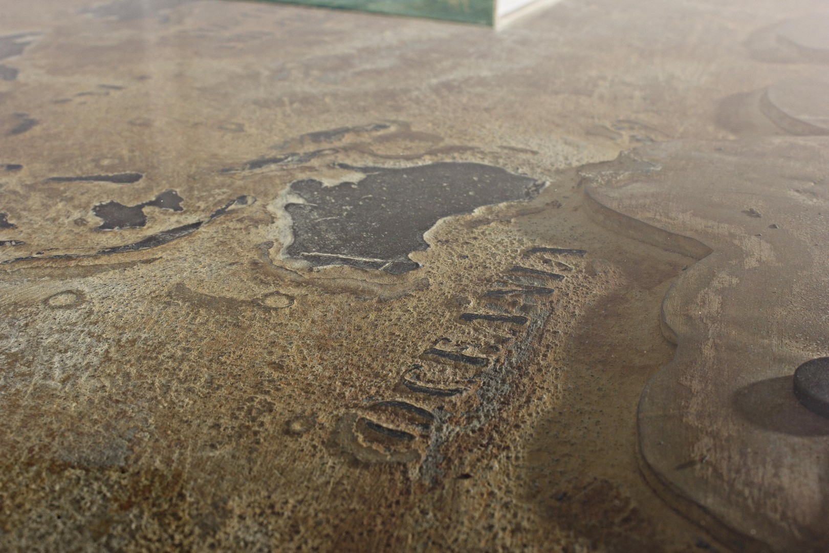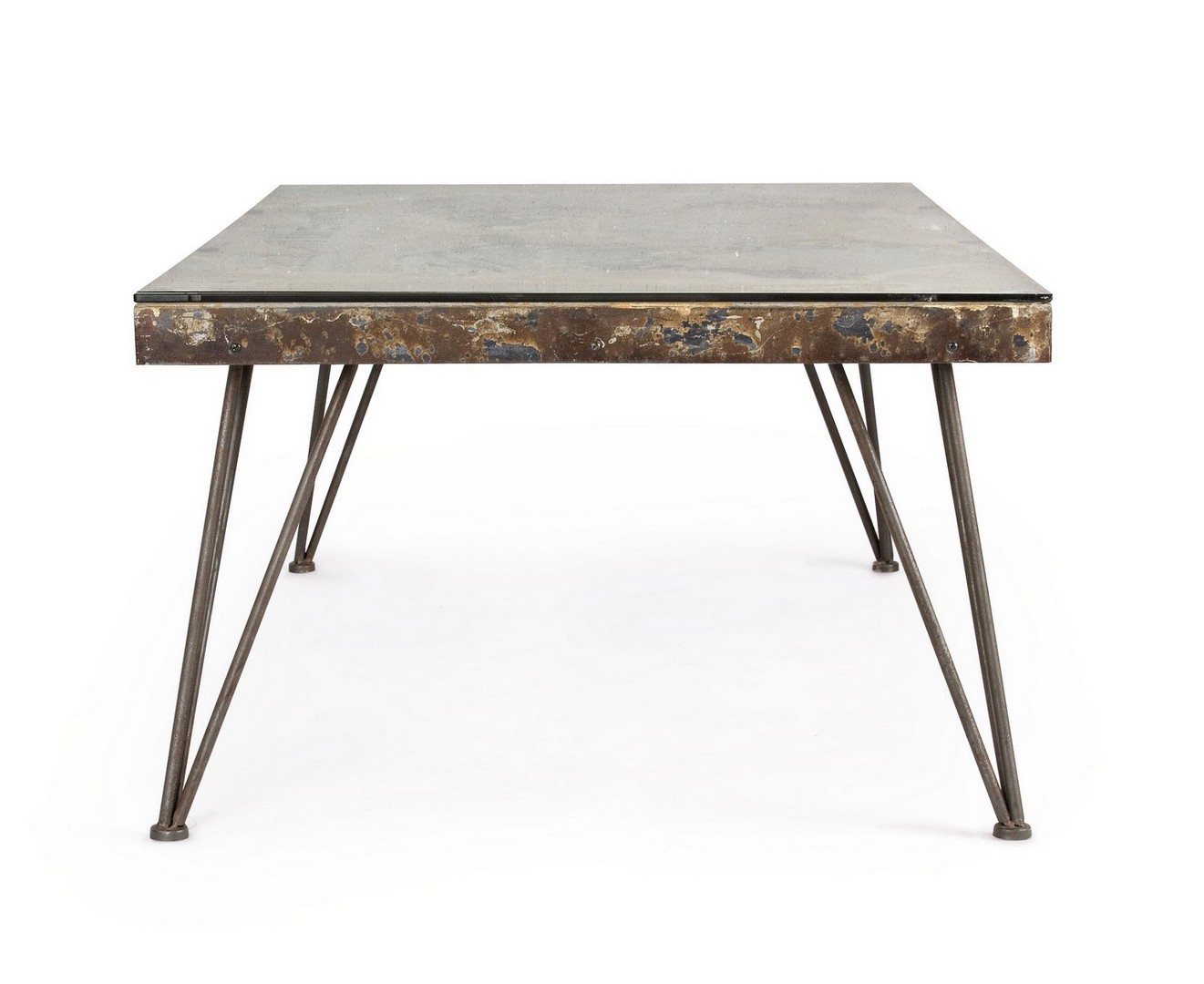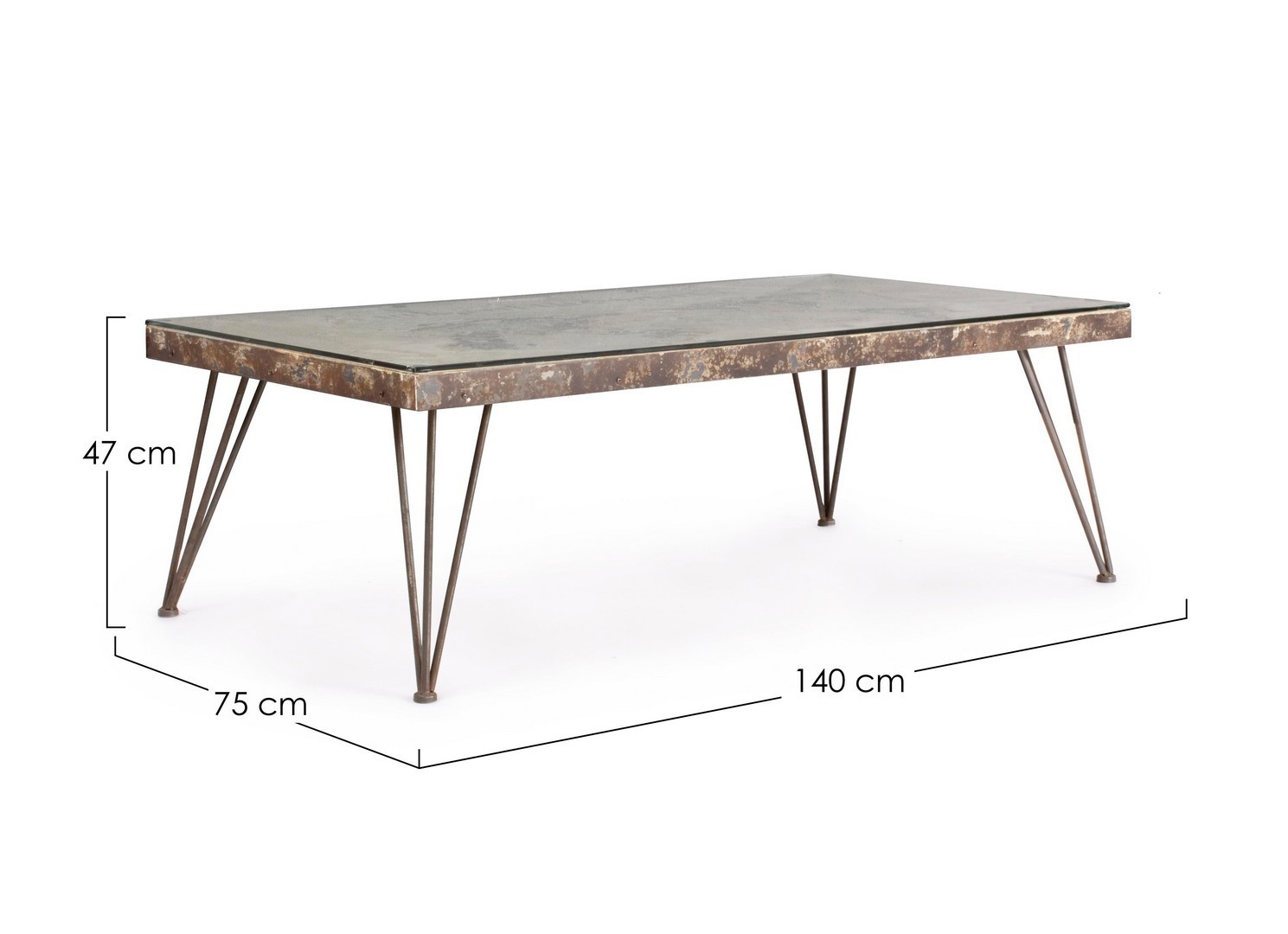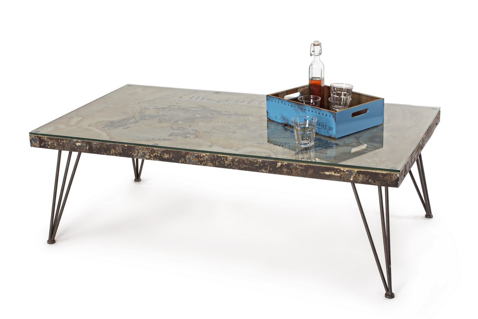 Starožitný oceľový rám, doska zo skla a mdf s cementovou dekoráciou.