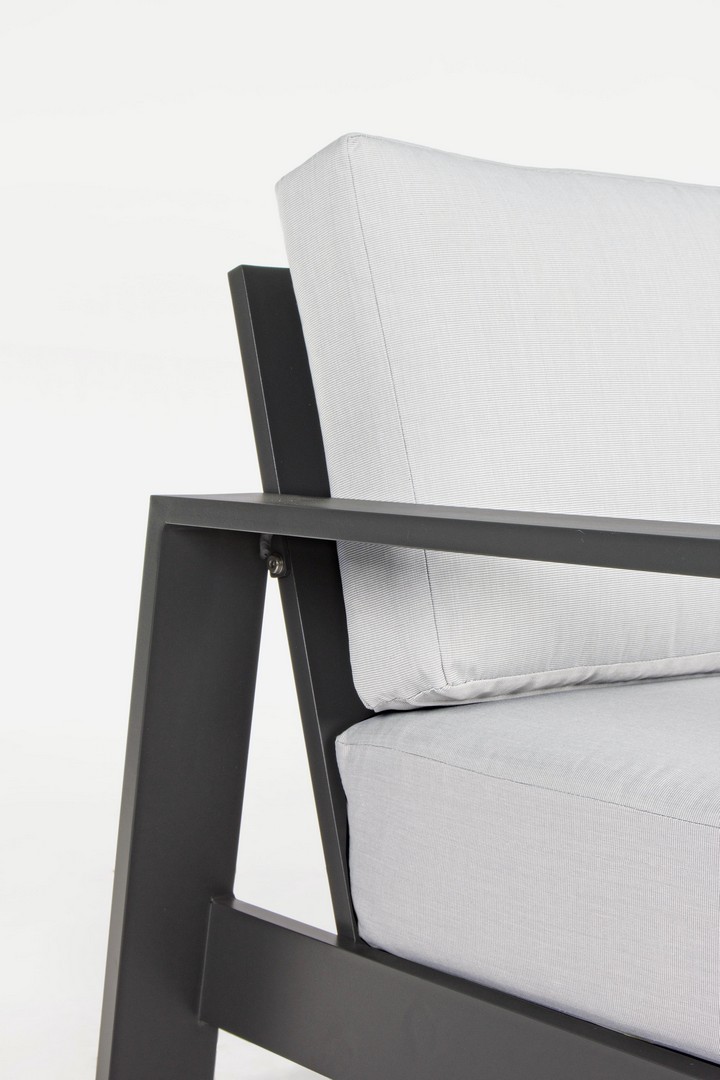 Práškovaná (polyesterová) hliníková konštrukcia. Sedáky a operadlá s odnímateľným poťahom z vodeodolnej olefínovej tkaniny (100 % polypropylén). Nastaviteľné nožičky.