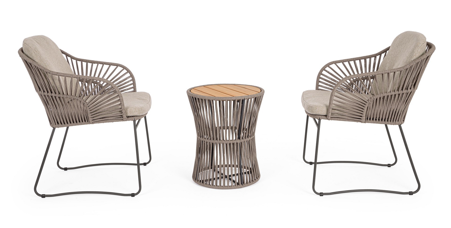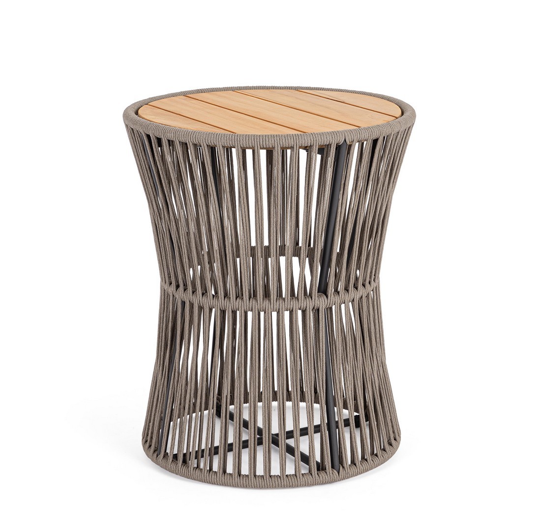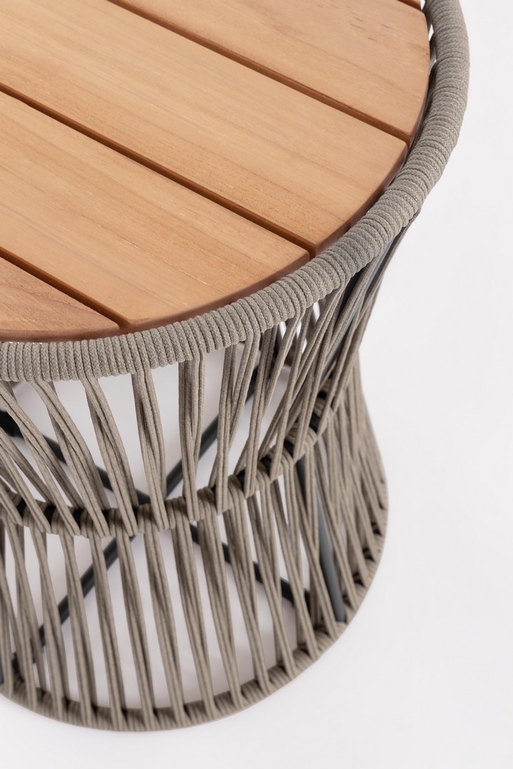 Konštrukcia z nehrdzavejúcej ocele (typ 201). Výplet na vonkajšie použitie z lana (polypropylén). Vrchná doska z teakového dreva – SVLK (certifikované drevo z udržateľne obhospodarovaných lesov).