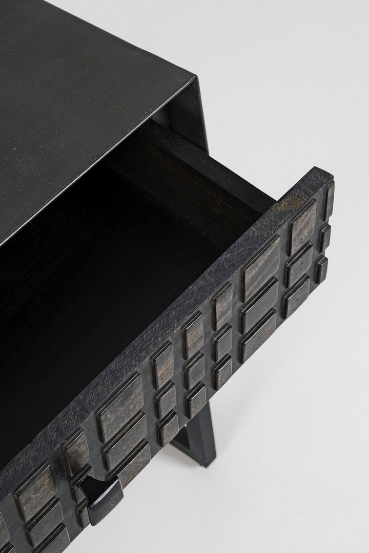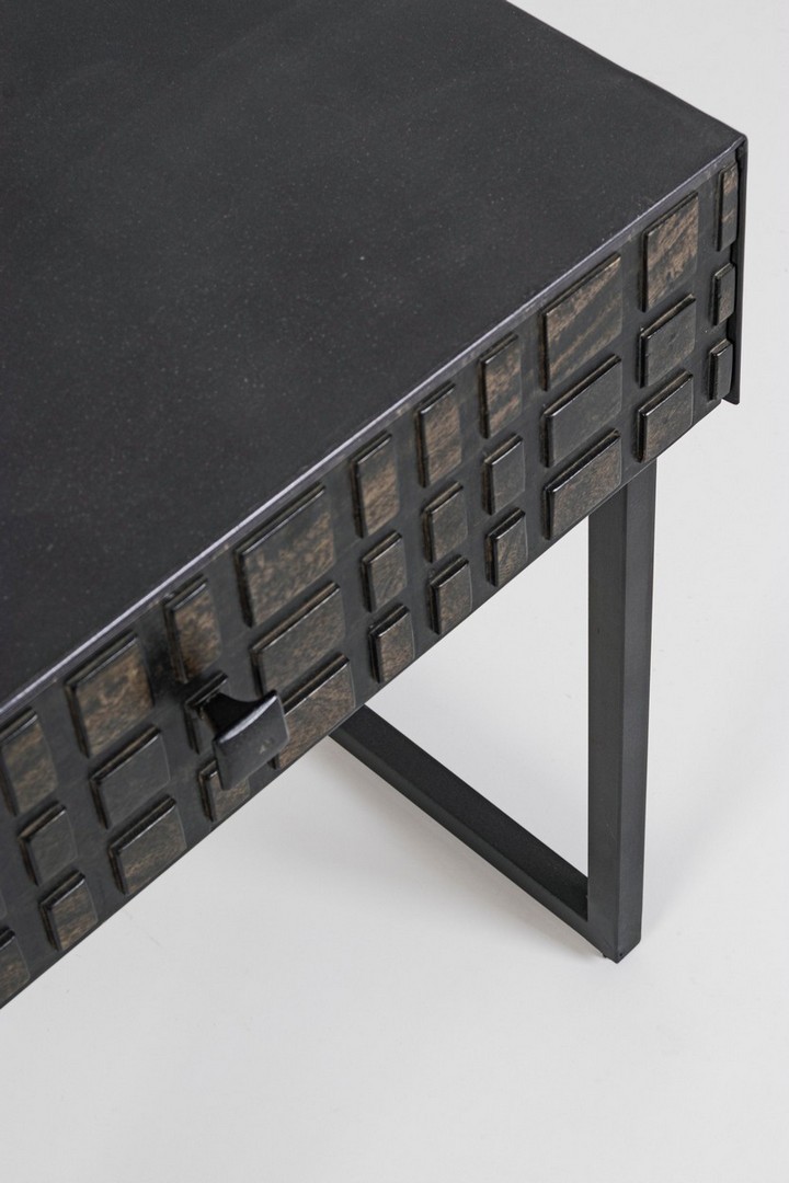 Oceľový rám s epoxidovým práškovým nástrekom. Zásuvky a dvierka z dreva. Nitrocelulózová úprava.