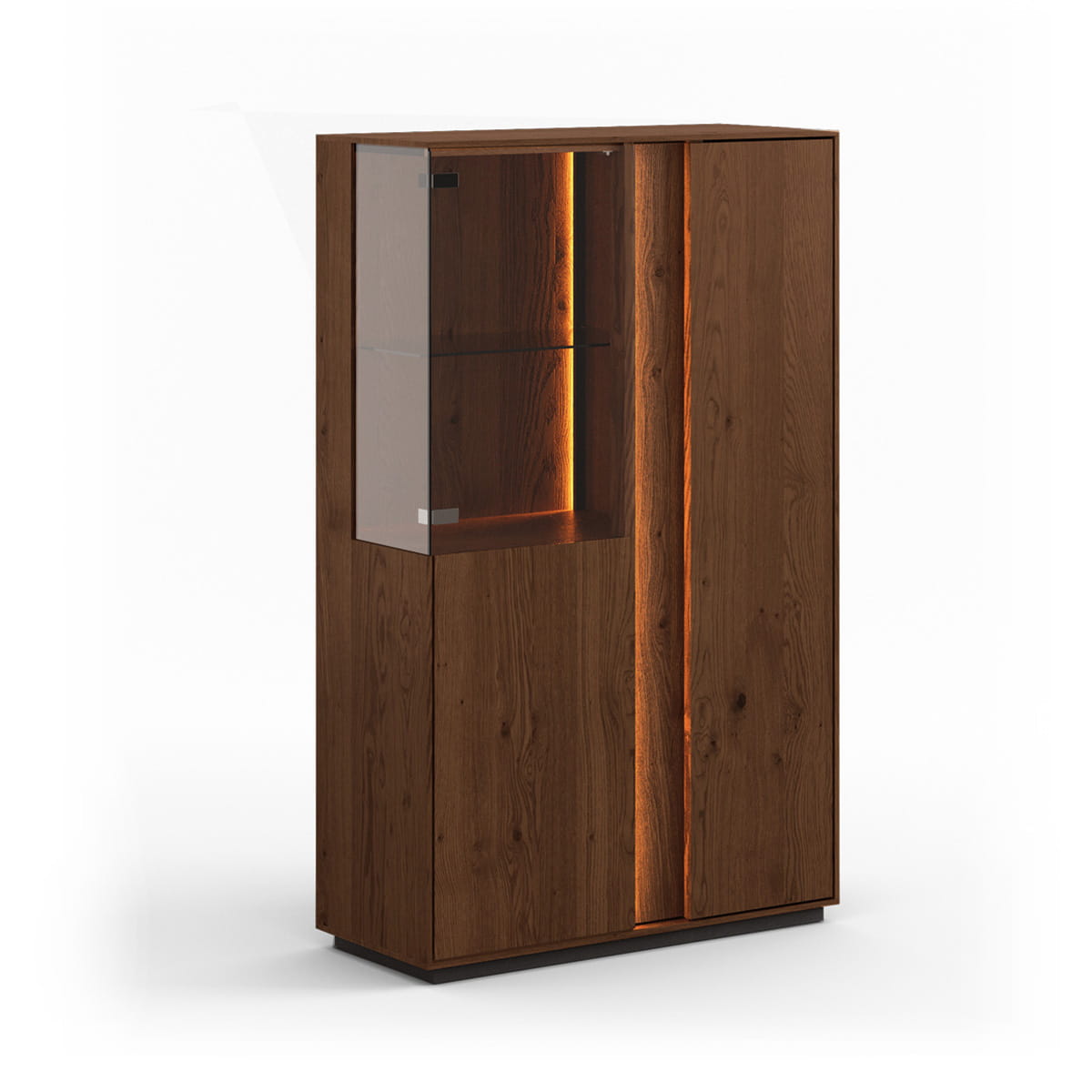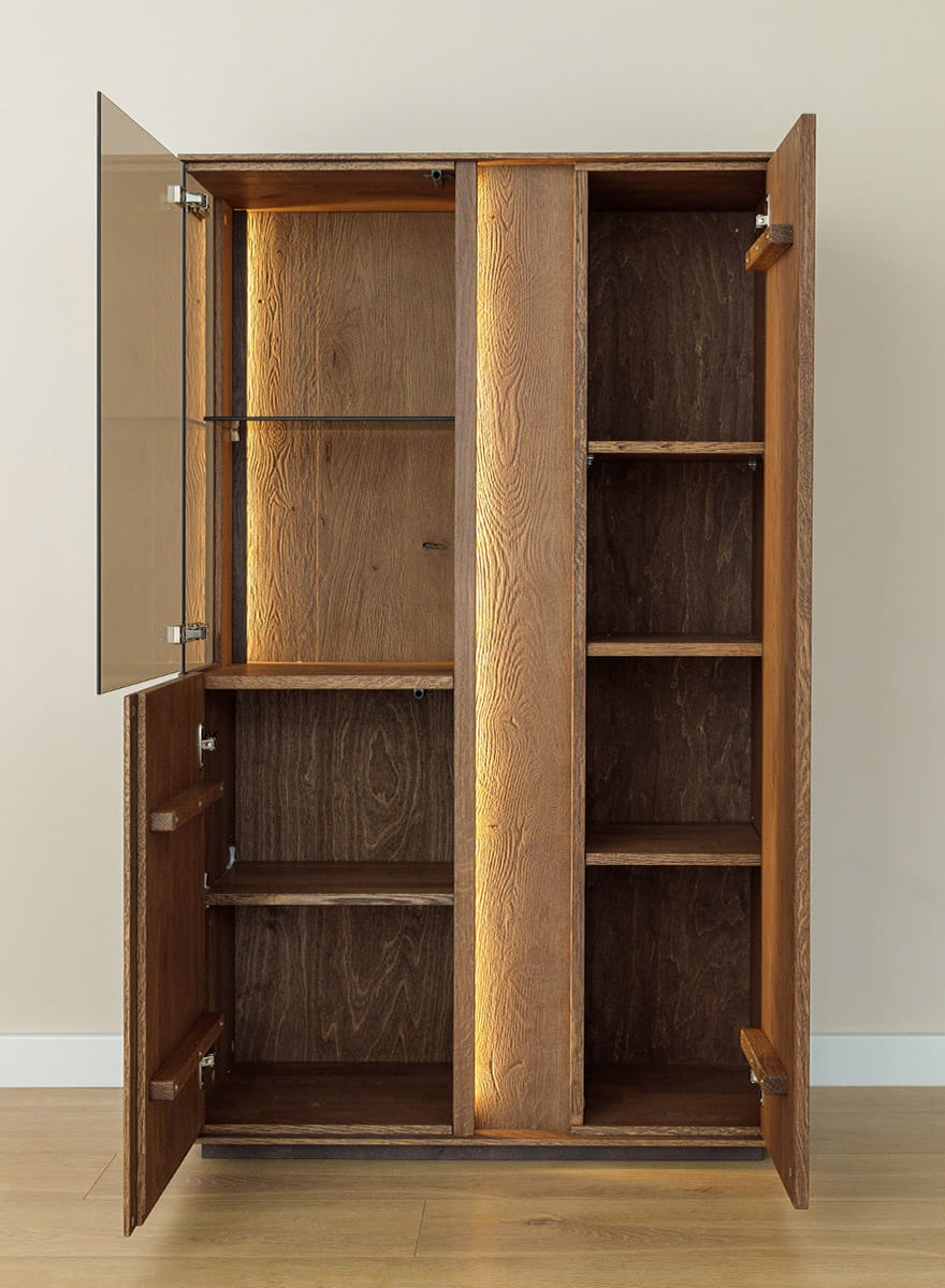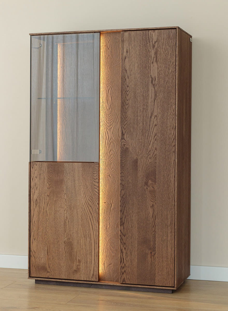 Pridať do sledovača cienNízka dvojitá vitrina Collodi je kus nábytku, ktorý okamžite upúta pozornosť. Divoký dub v hlbokom tabakovom odtieni, výrazná štruktúra a olejovaná povrchová úprava vytvárajú kombináciu, ktorá do interiéru vnesie teplo a štýl. Je ideálny, ak chcete svojmu interiéru dodať noblesu bez toho, aby zahltil priestor. Jednoduchý tvar, prírodné drevo a sklenená vitrína s LED podsvietením – elegancia v najlepšom svetle.