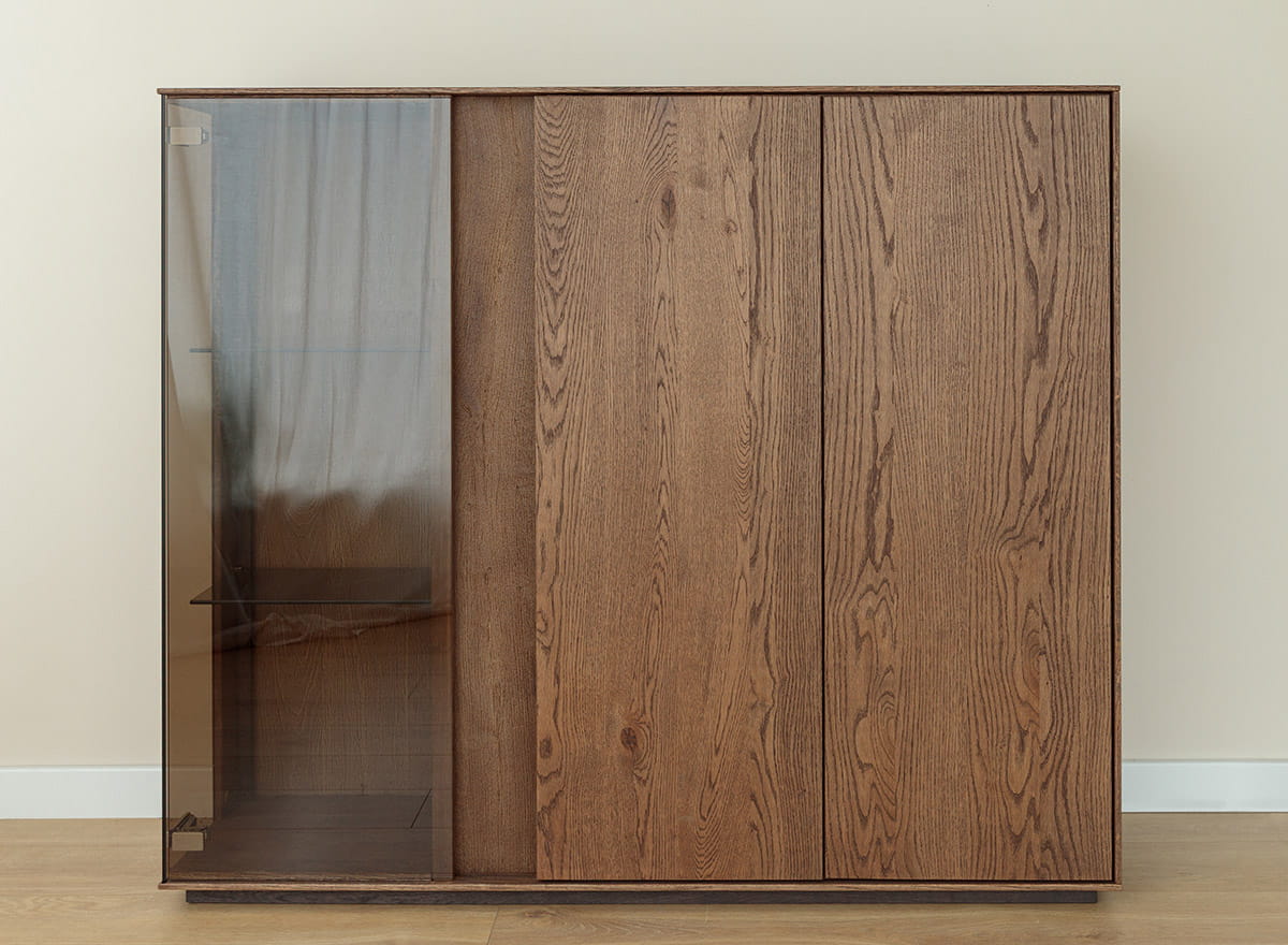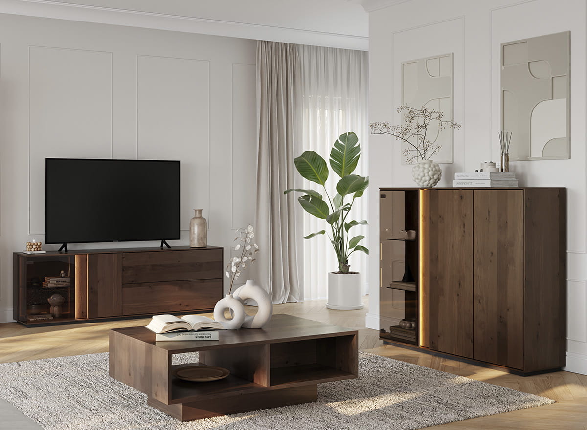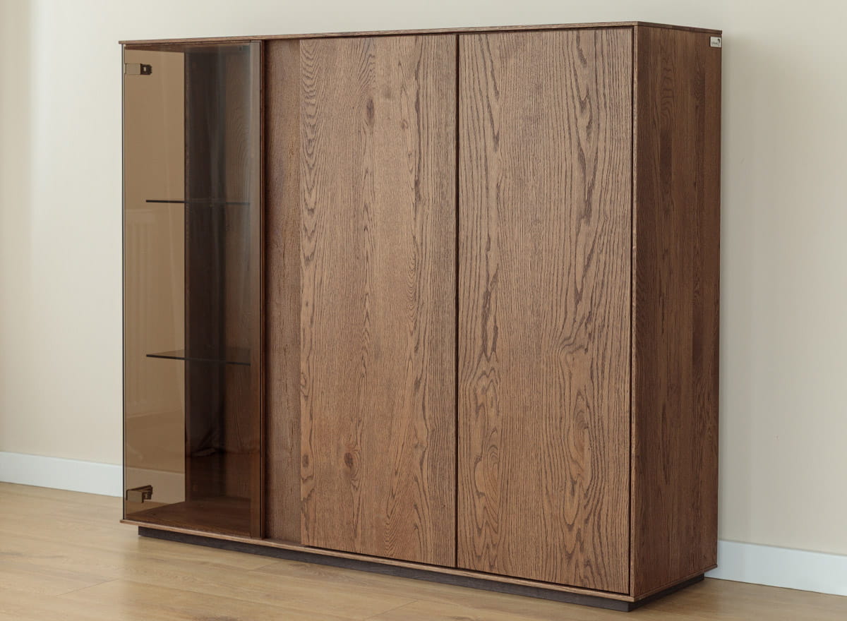 Pridať do sledovača cienNízka trojitá vitrína Collodi úspešne kombinuje dizajn, praktickosť a kvalitu, ktorú očakávate. Dominuje teplý odtieň tabaku, výrazná kresba divokého duba a olejovaná povrchová úprava – to všetko (a ešte viac) spôsobuje, že drevo pôsobí prirodzene, ale zároveň nadmieru štýlovo. Nie je to len miesto na dekoráciu, ale prvok, ktorý vnáša do priestoru poriadok a dodáva každému interiéru útulnosť. Jeho jednoduchý tvar a jemné presklenie mu dodávajú ľahký nádych, zatiaľ čo LED podsvietenie dotvára atmosféru najmä večer.