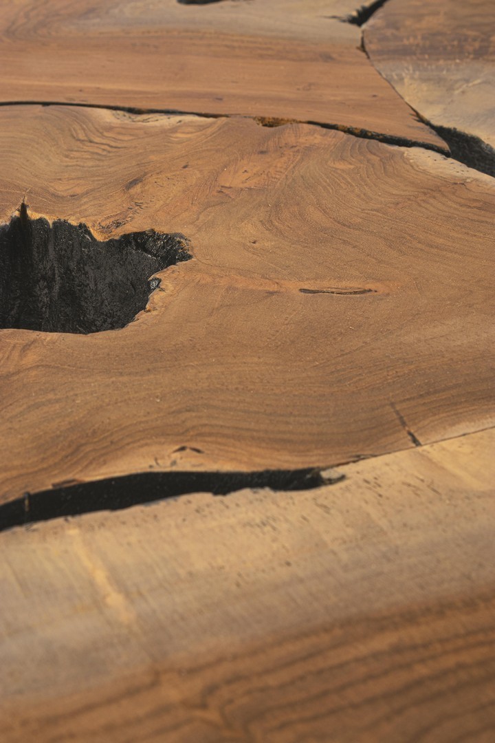 Originál teakové korene top. Nitrocelulózová úprava. Nohy potiahnuté oceľou. Pôvodné tvary vytvorené z dreva sú len orientačné, všetky položky sa budú navzájom líšiť, s mierne odlišnými veľkosťami.