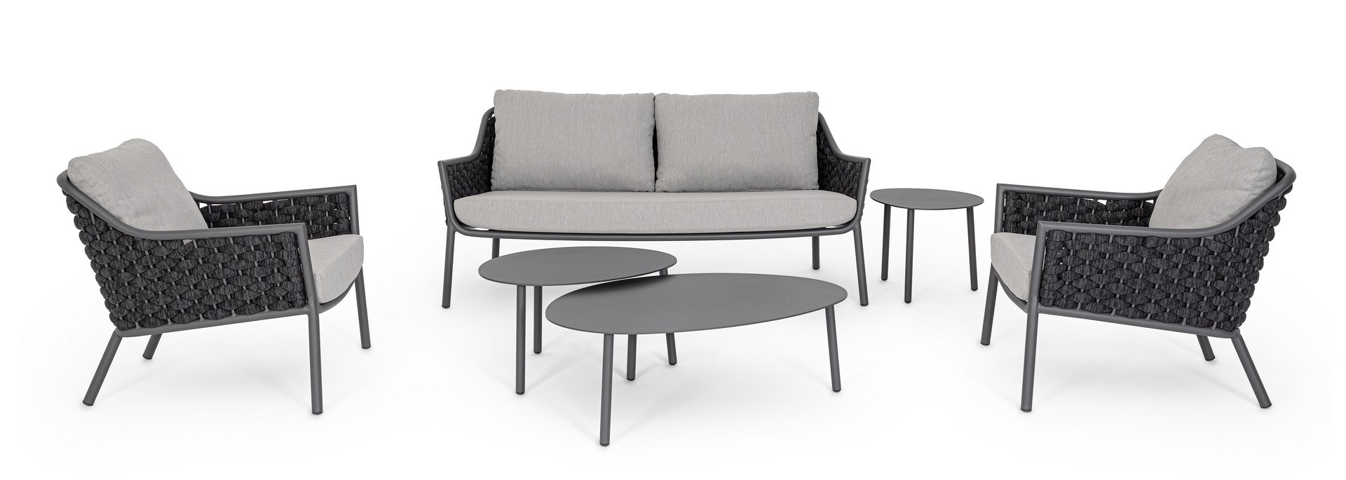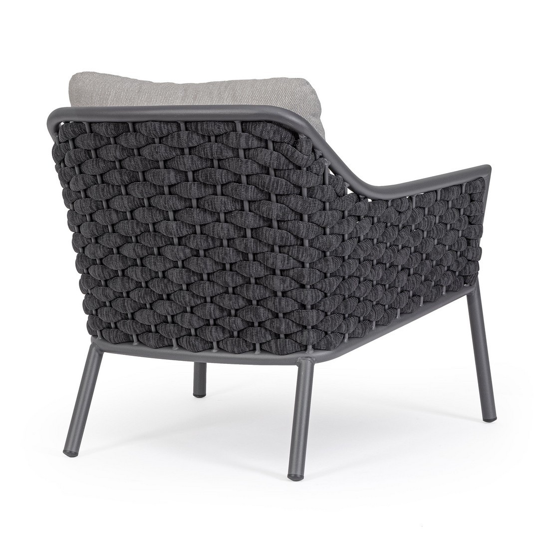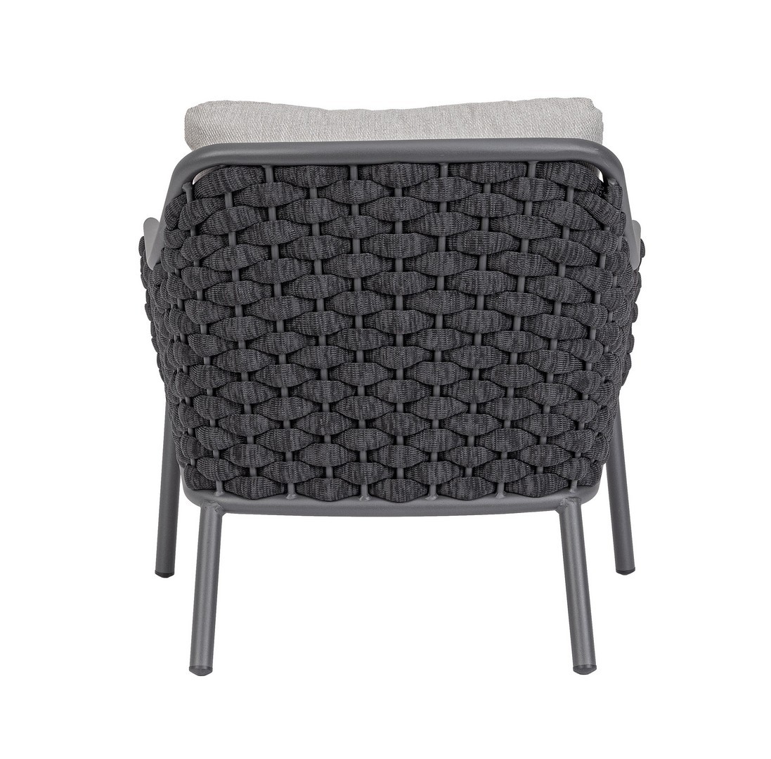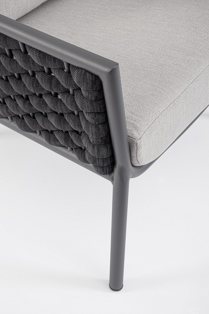 Hliníkový rám s práškovým nástrekom (polyester). Výplet z textilenového lana s výplňou z nitrilového kaučuku. Sedací vankúš s odnímateľným poťahom z vodeodolnej olefínovej tkaniny (100 % polypropylén).