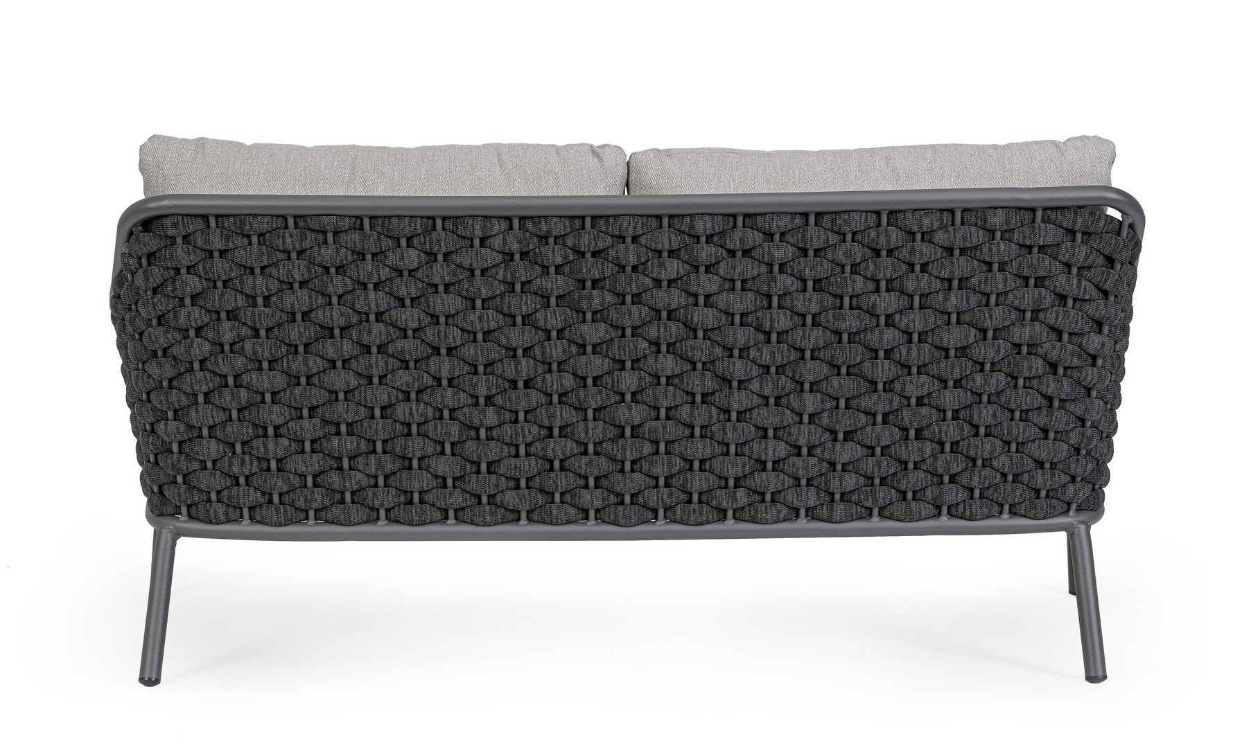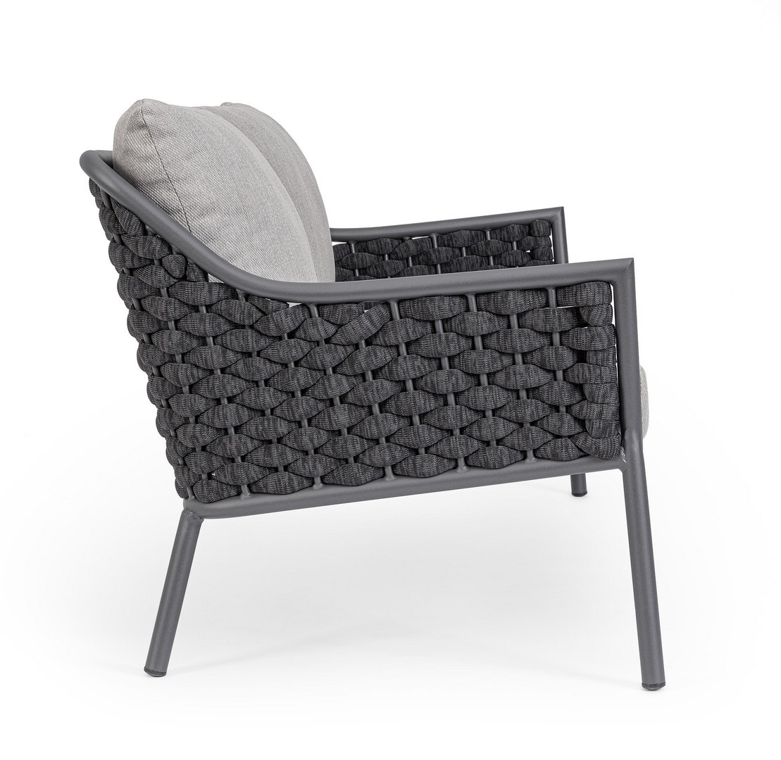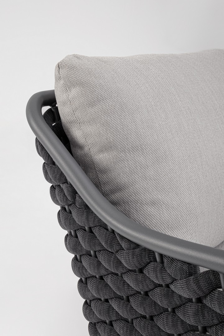 Hliníkový rám s práškovým nástrekom (polyester). Výplet z textilenového lana s výplňou z nitrilového kaučuku. Sedací vankúš s odnímateľným poťahom z vodeodolnej olefínovej tkaniny (100 % polypropylén).
