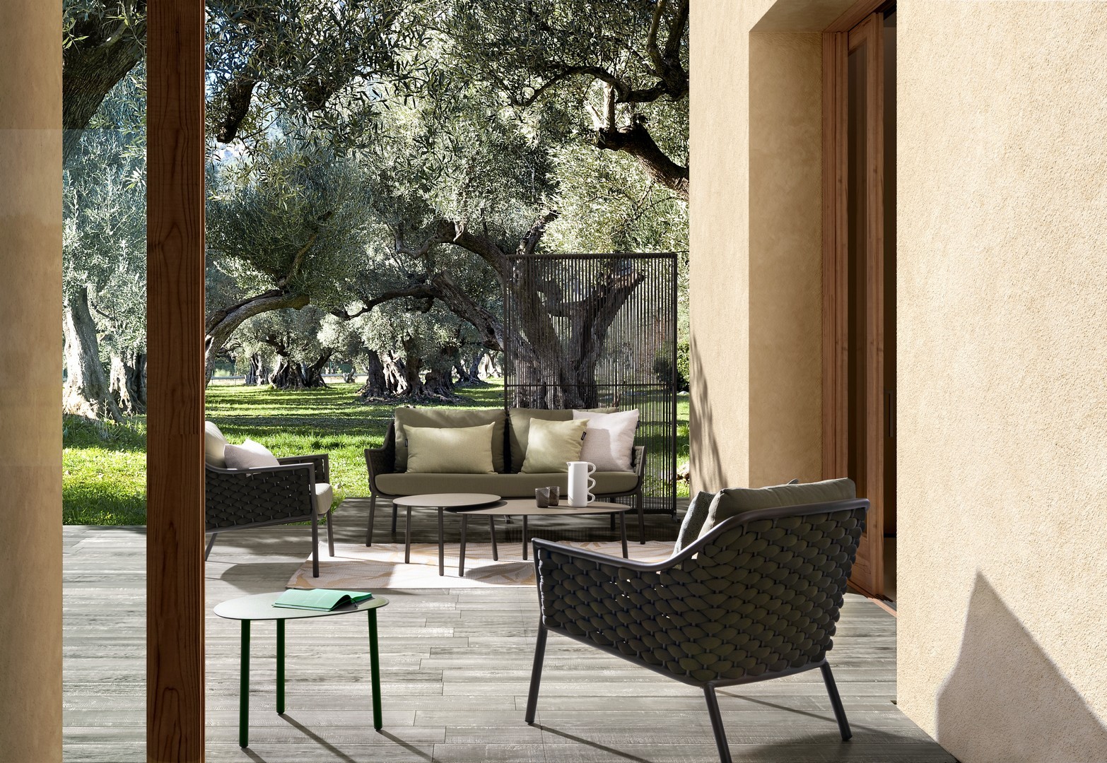 Hliníkový rám s práškovým nástrekom (polyester). Výplet z textilenového lana s výplňou z nitrilového kaučuku. Sedací vankúš s odnímateľným poťahom z vodeodolnej olefínovej tkaniny (100 % polypropylén).