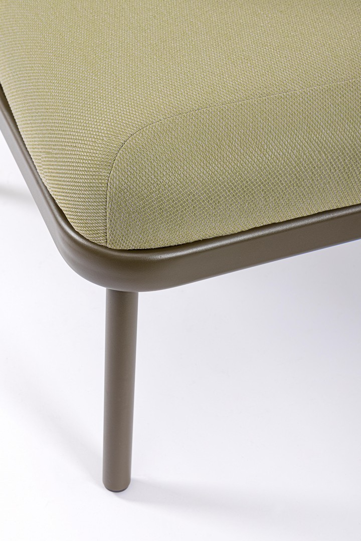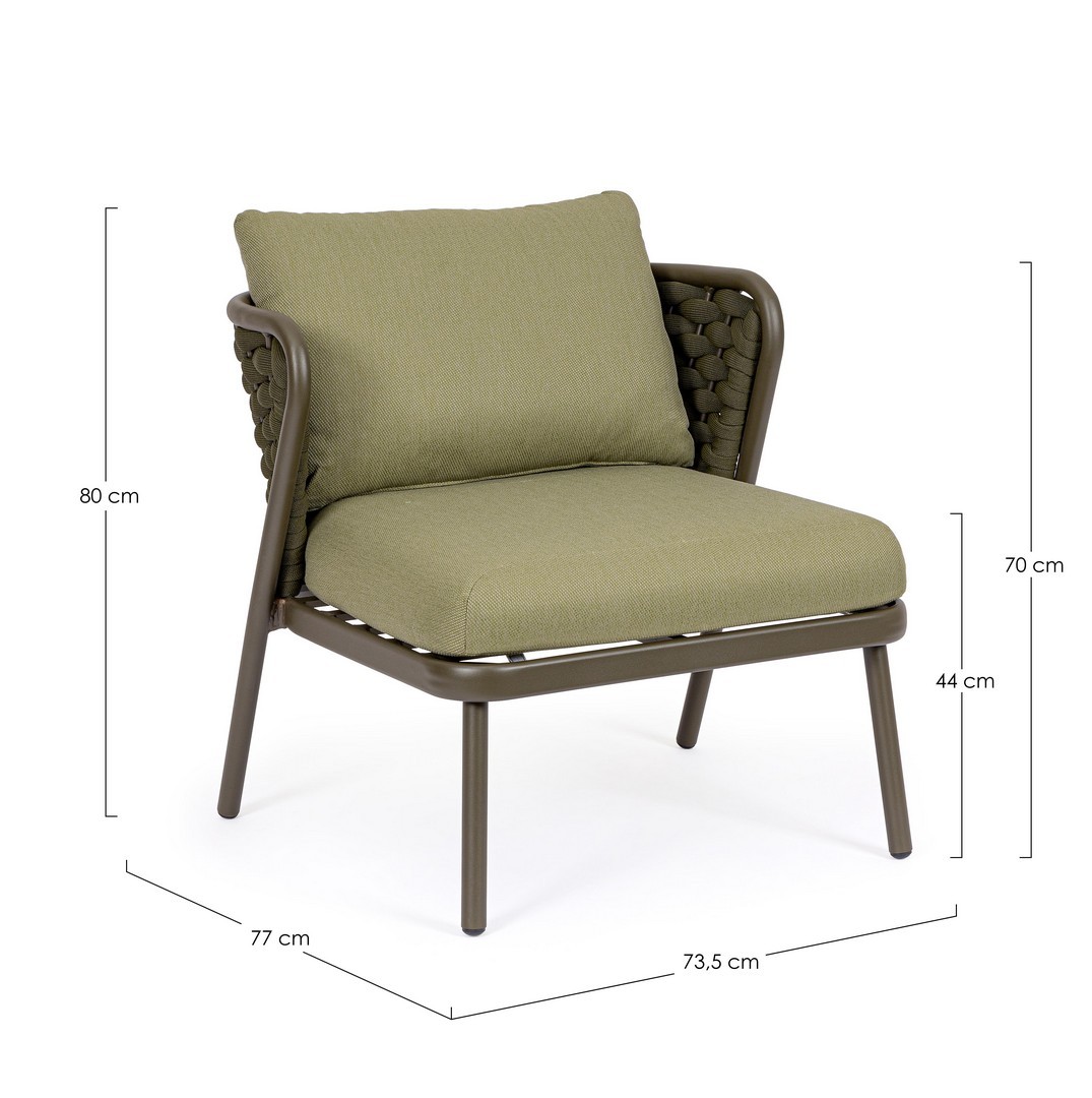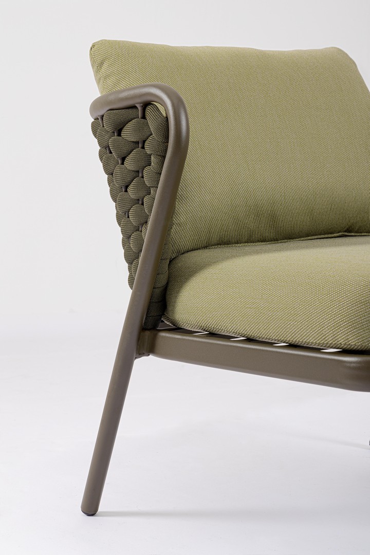 Hliníkový rám s práškovým nástrekom (polyester). Výplet z textilenového lana s výplňou z nitrilového kaučuku. Sedací vankúš s odnímateľným poťahom z vodeodolnej olefínovej tkaniny (100 % polypropylén).