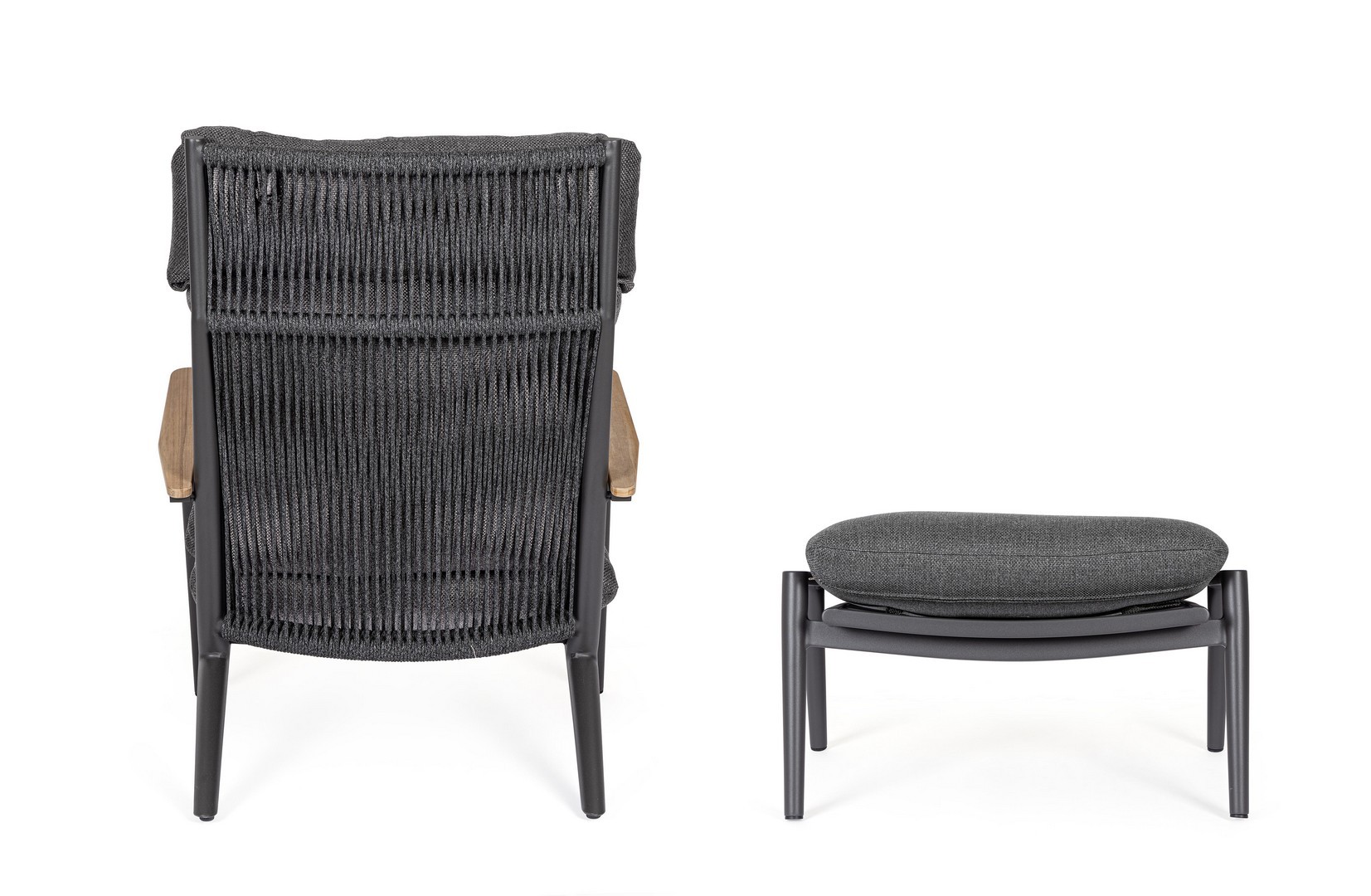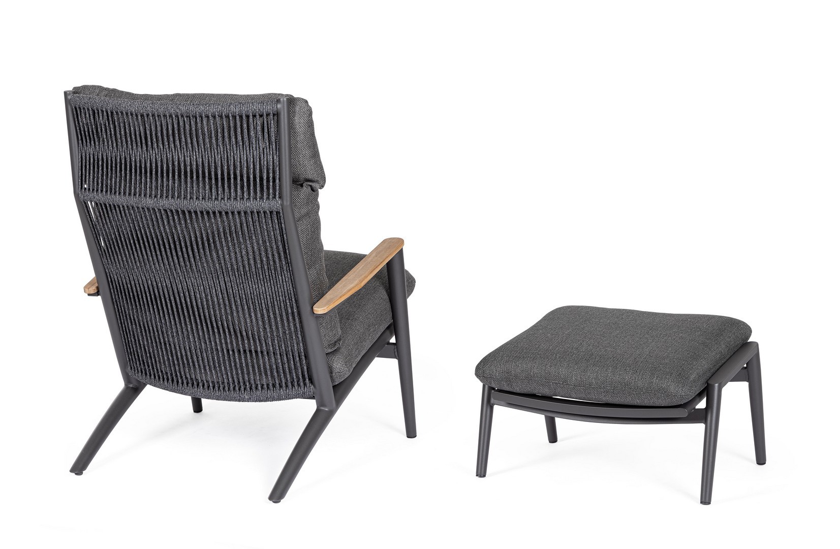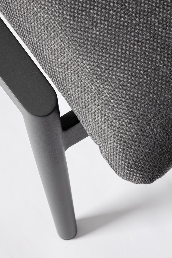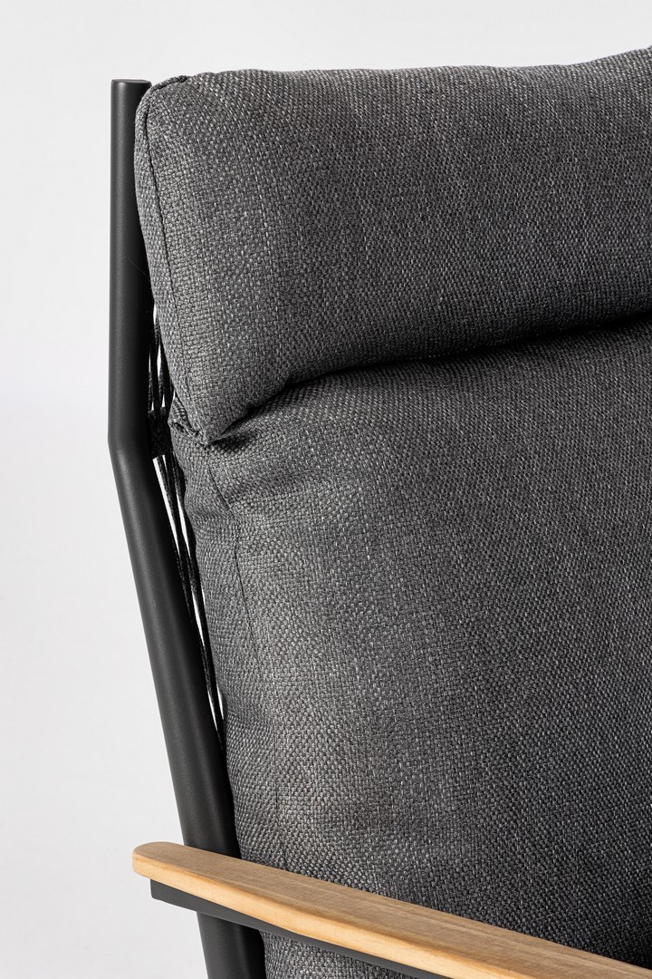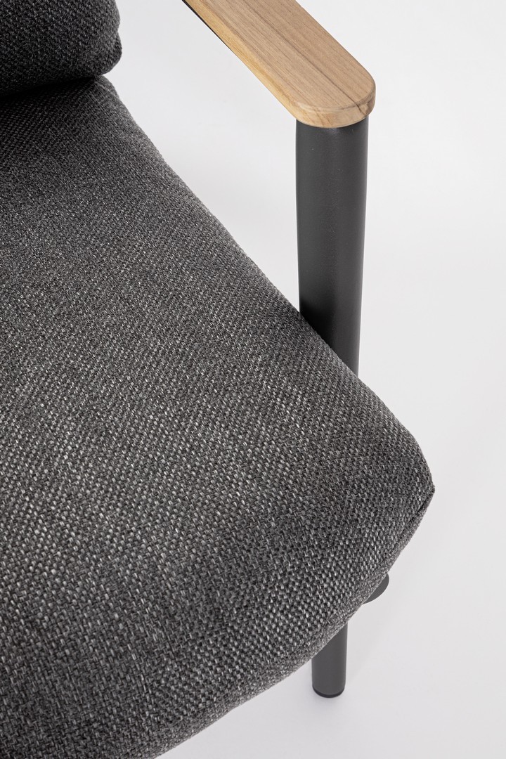 Konštrukcia z práškovaného hliníka (polyester). Operadlo s výpletom z polyesterových šnúr. Lakťové opierky s teakovými vložkami. Odnímateľné vankúše s poťahom z vodeodolnej olefínovej tkaniny (100 % polypropylén).