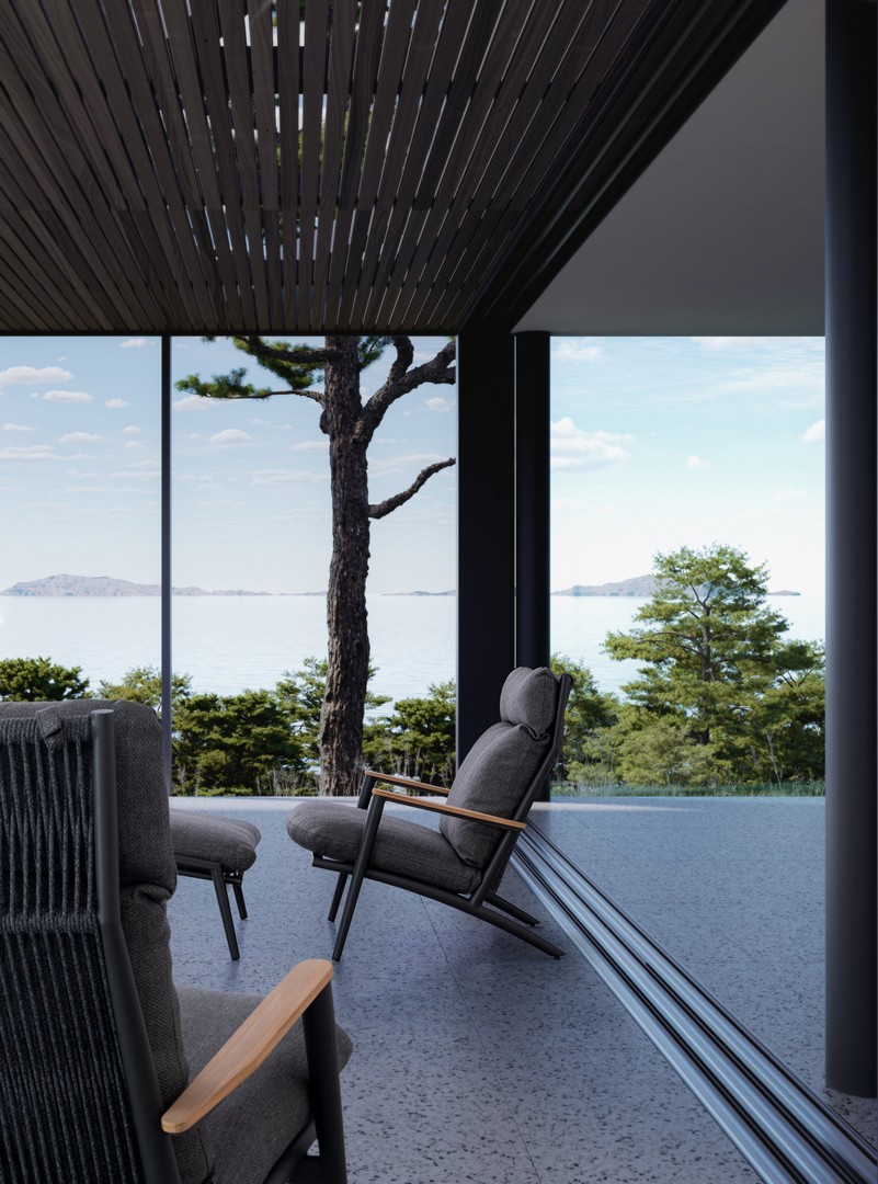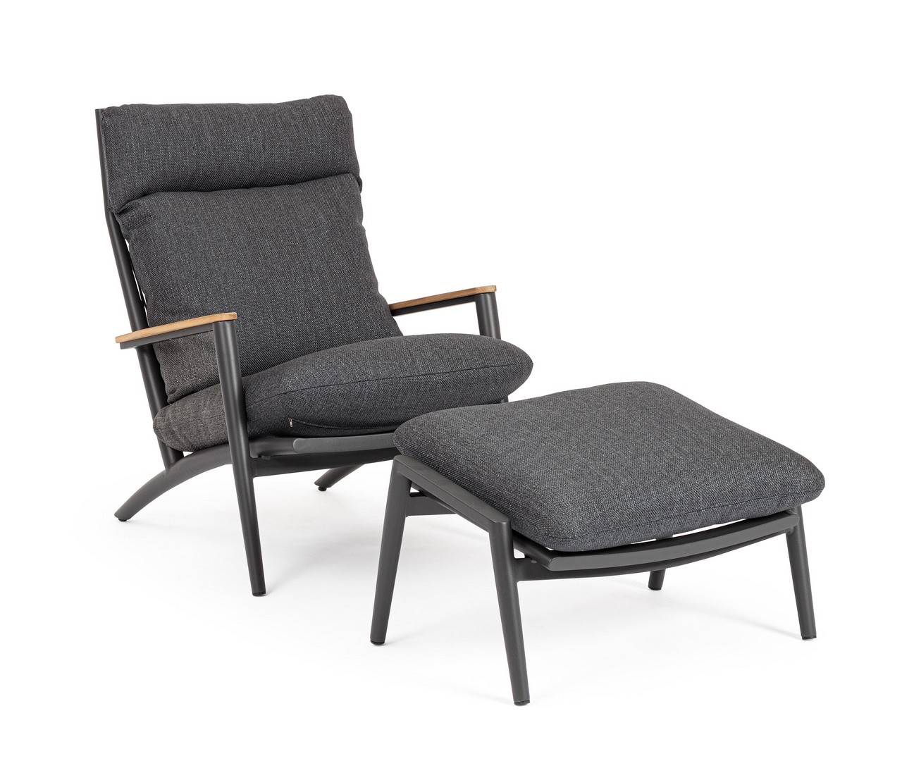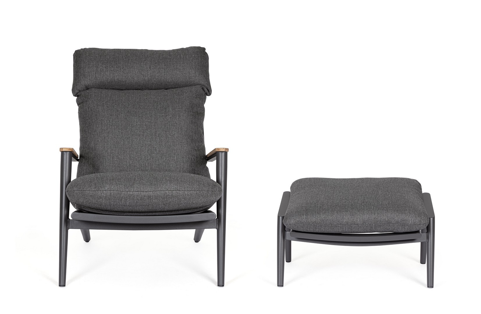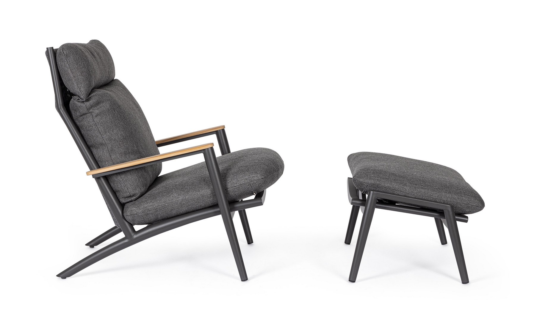 Konštrukcia z práškovaného hliníka (polyester). Operadlo s výpletom z polyesterových šnúr. Lakťové opierky s teakovými vložkami. Odnímateľné vankúše s poťahom z vodeodolnej olefínovej tkaniny (100 % polypropylén).