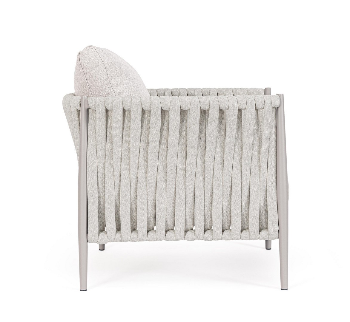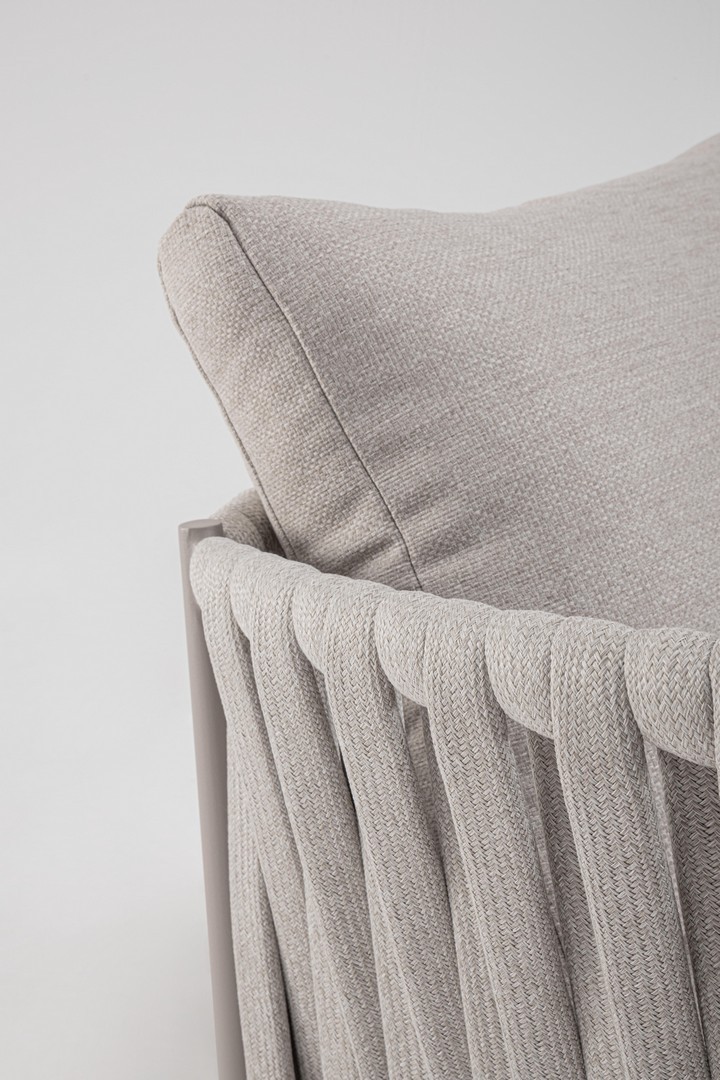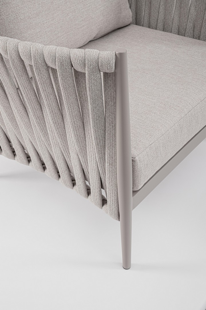 Hliníkový rám s práškovým nástrekom (polyester). Výplet z tetoronového lana (100 % polyester) s gumovou výplňou (polyetylén). Sedák a operadlo s vankúšmi s odnímateľným poťahom z vodeodolnej olefínovej tkaniny (100 % polypropylén).