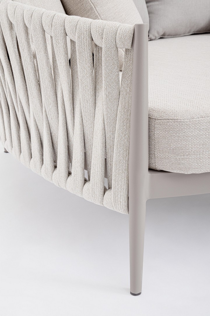 Hliníkový rám s práškovou polyesterovou povrchovou úpravou. Výplet z tetorónového lana (100 % polyester) s gumovou výplňou (polyetylén). Sedák a operadlo s odnímateľným poťahom z vodoodpudivej olefínovej látky (100 % polypropylén).