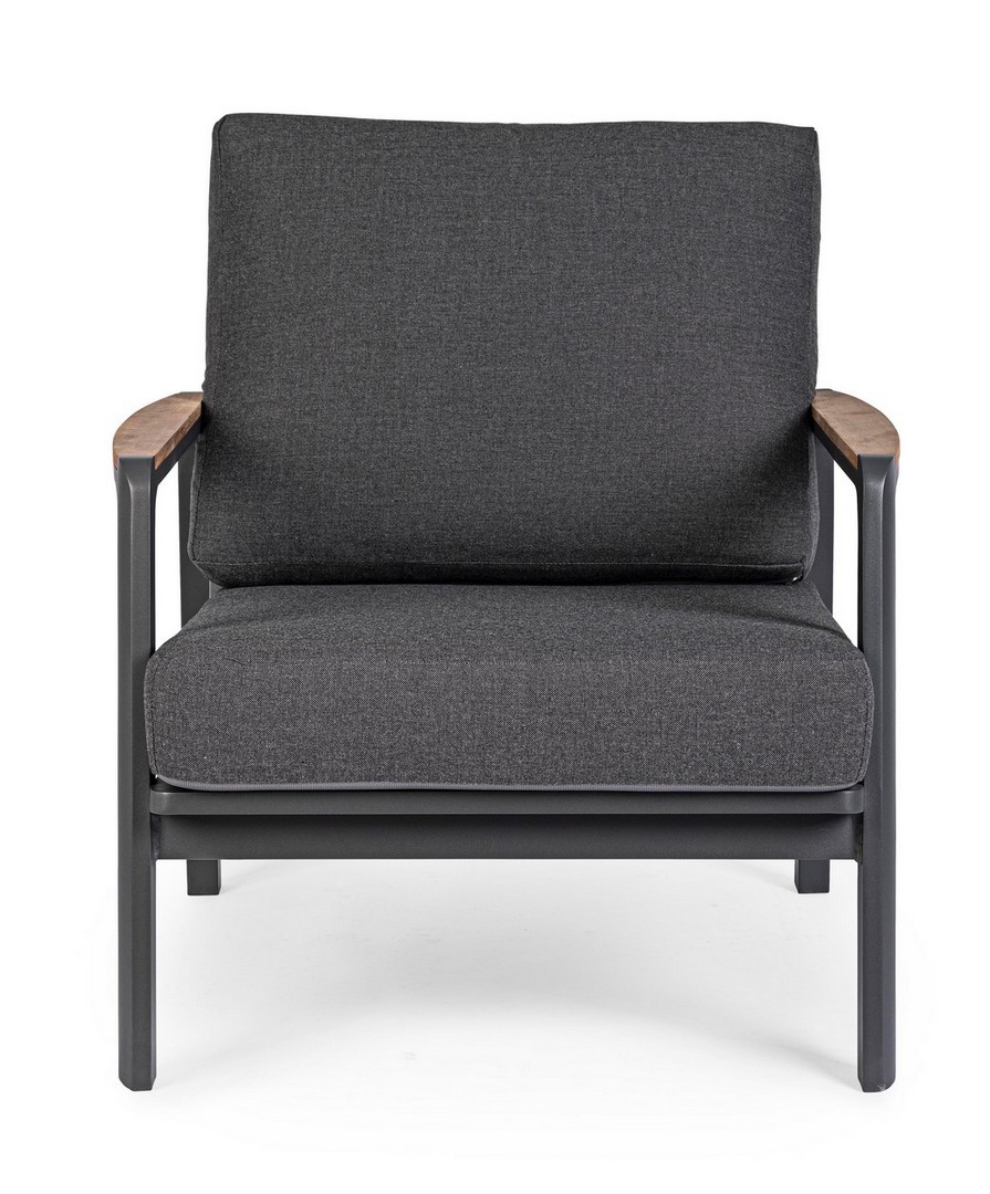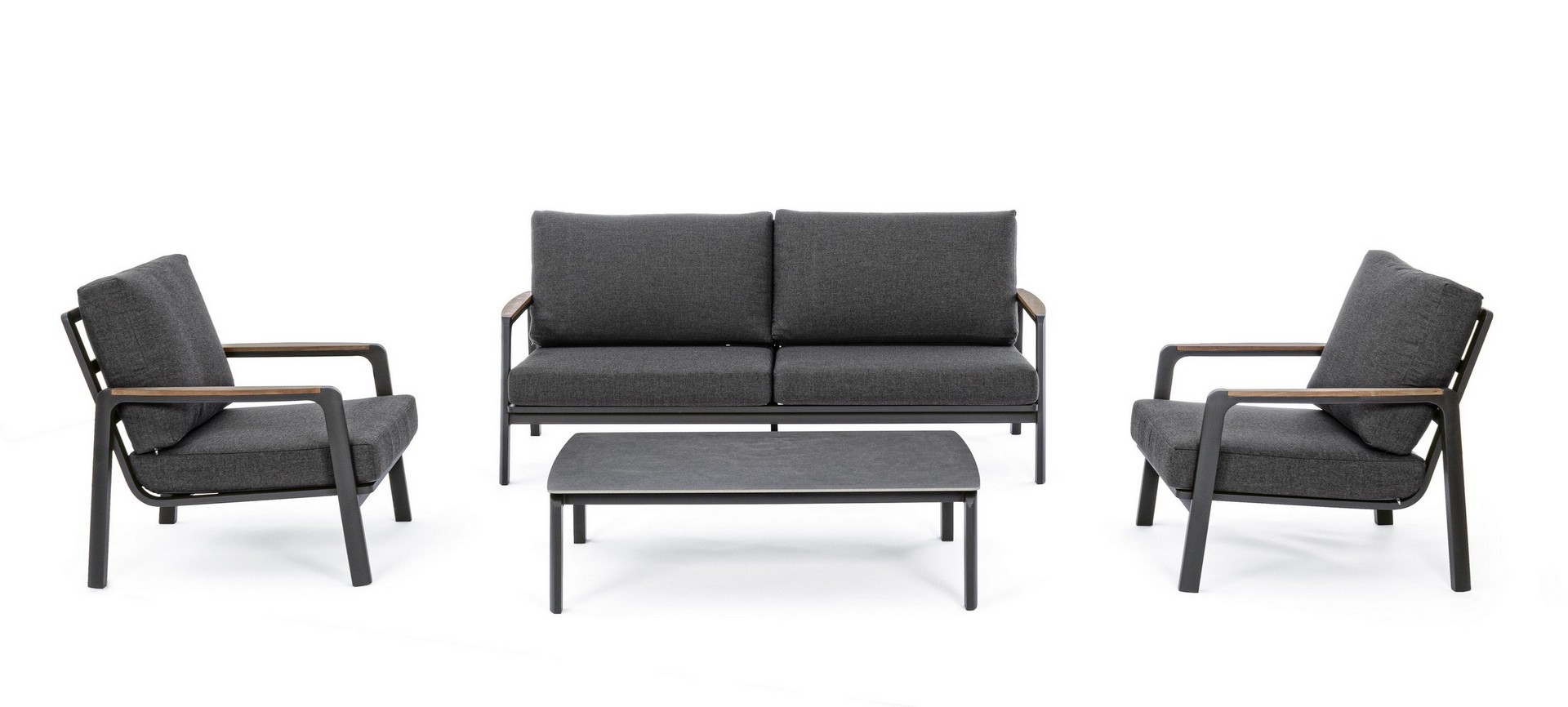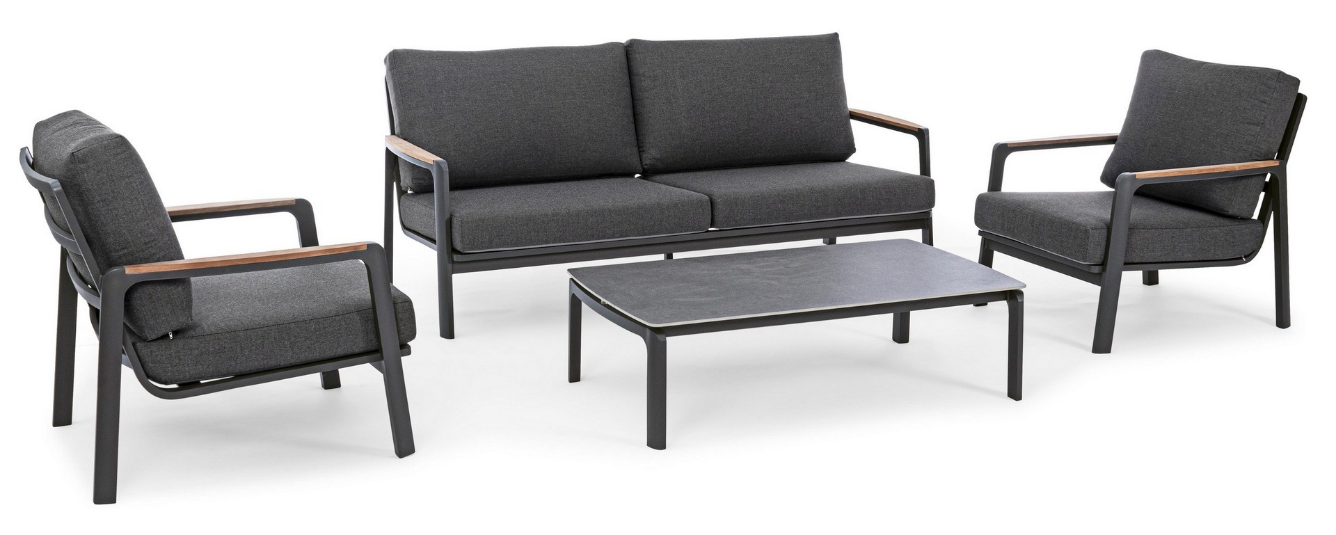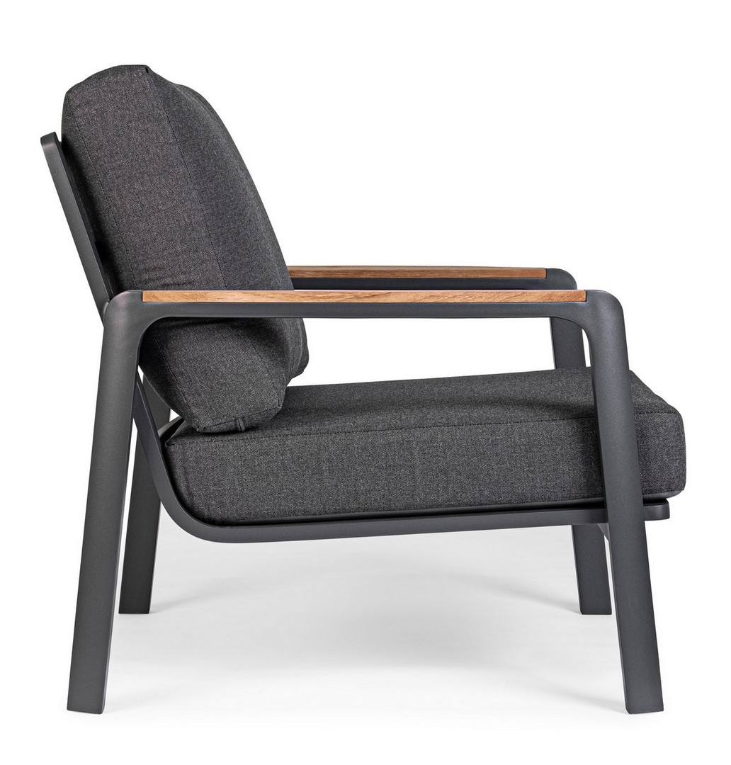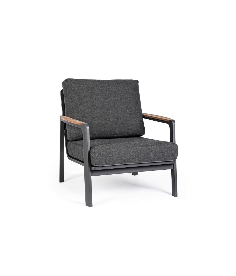 Práškovaná (polyesterová) hliníková konštrukcia. Lakťové opierky s teakovými vložkami. Sedáky a operadlá s vankúšmi s odnímateľným poťahom z akrylovej tkaniny.