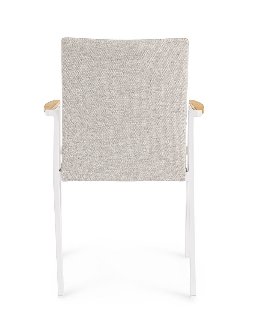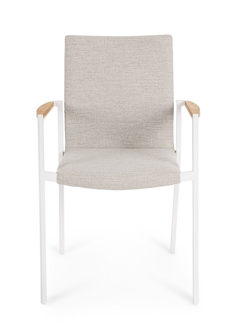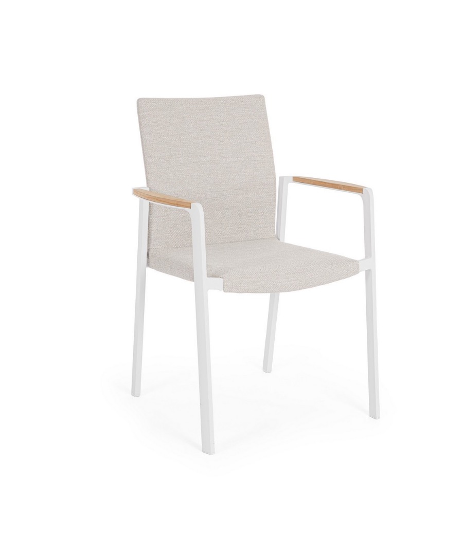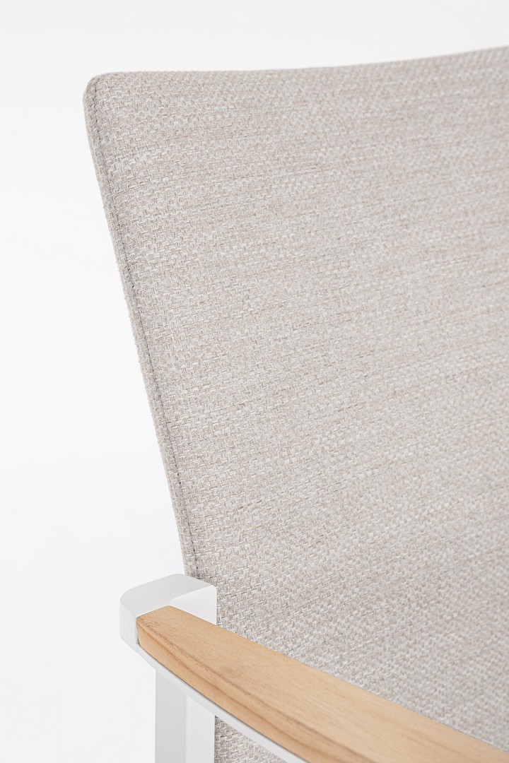 Konštrukcia z hliníka s práškovou povrchovou úpravou (polyester). Opierky rúk s vložkami z tíkového dreva. Poťah sedadla a operadla z vodoodpudivej olefínovej tkaniny (100 % polypropylén). Výplň z rýchloschnúcej peny.