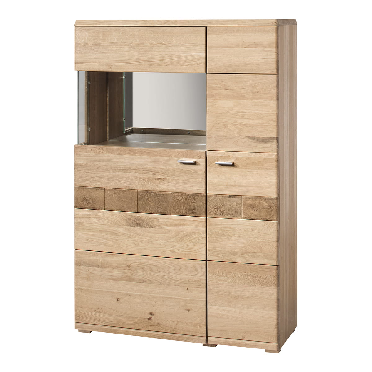 Drevená komoda Fiorino s vitrínou je pevný kus nábytku s čelami vyrobenými z masívu duba. Viditeľné zrná zdôrazňujú ich prírodný pôvod, vďaka čomu si dubová komoda nájde cestu aj do viac klasických priestorov. Veľké suky v tmavších odtieňoch a jemné línie robia z komody Fiorino výrazný kus nábytku, ktorý oživí každú obývaciu izbu.