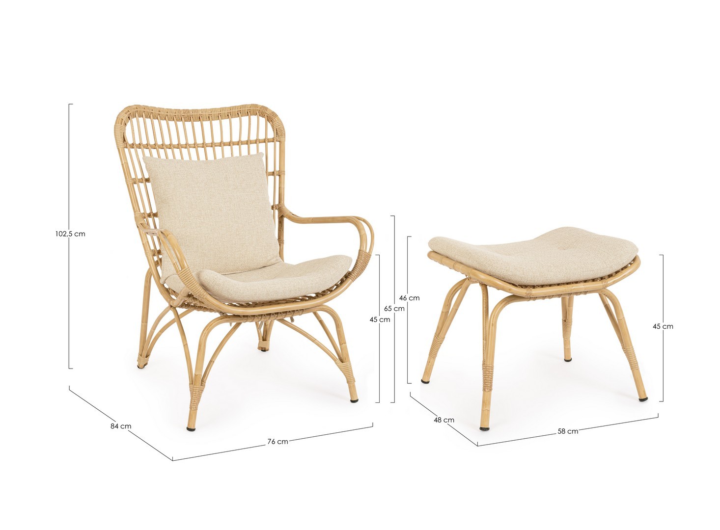 Hliníkový rám s práškovým nástrekom (polyester) s ratanovým efektom, výplet zo syntetického vlákna (okrúhle, 10 mm). Sedací vankúš s neodnímateľným poťahom z vodeodolnej a UV-odolnej tkaniny Sunproof Olefin (100 % polypropylén).