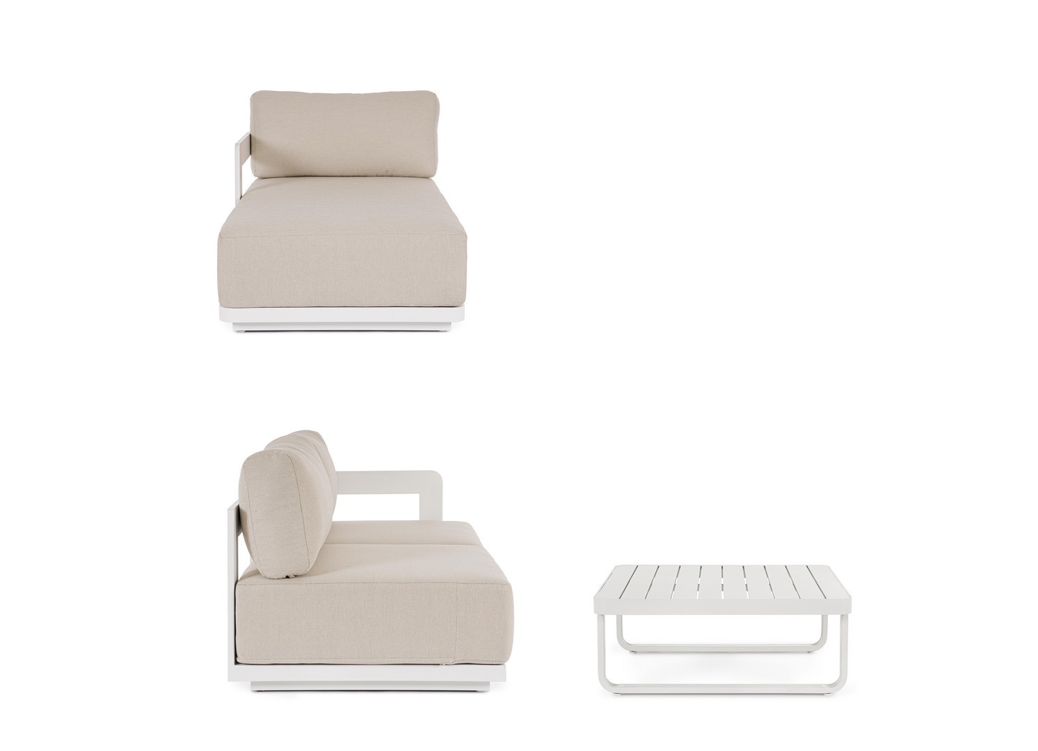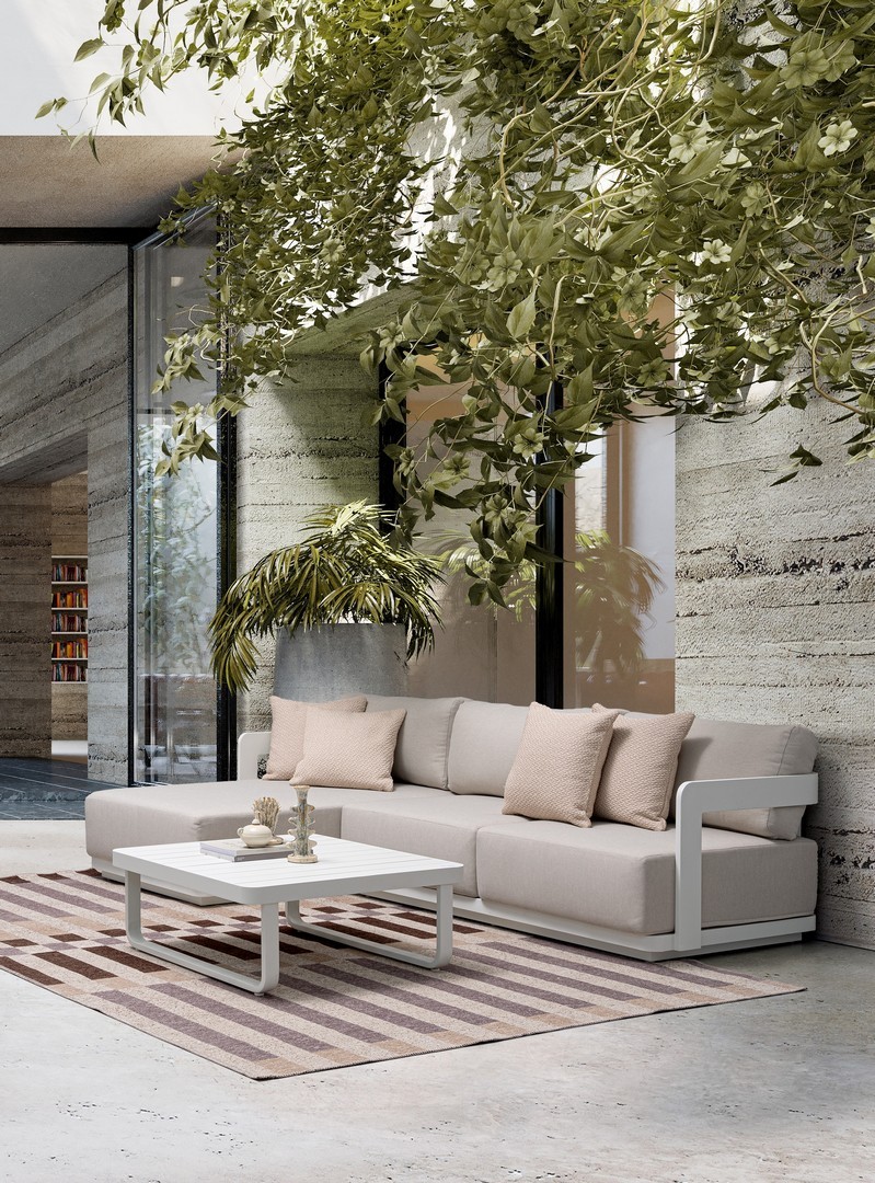 Konštrukcia z hliníka s práškovým nástrekom (polyester). Odnímateľné sedacie a chrbtové vankúše s vodoodpudivou tkaninou olefín (100 % polypropylén).