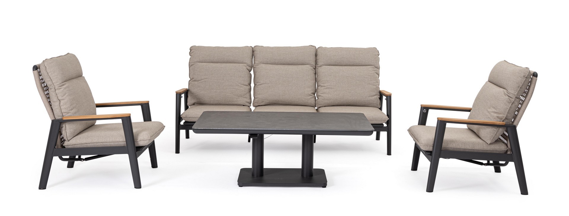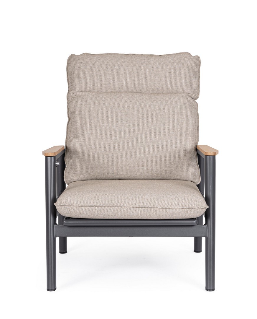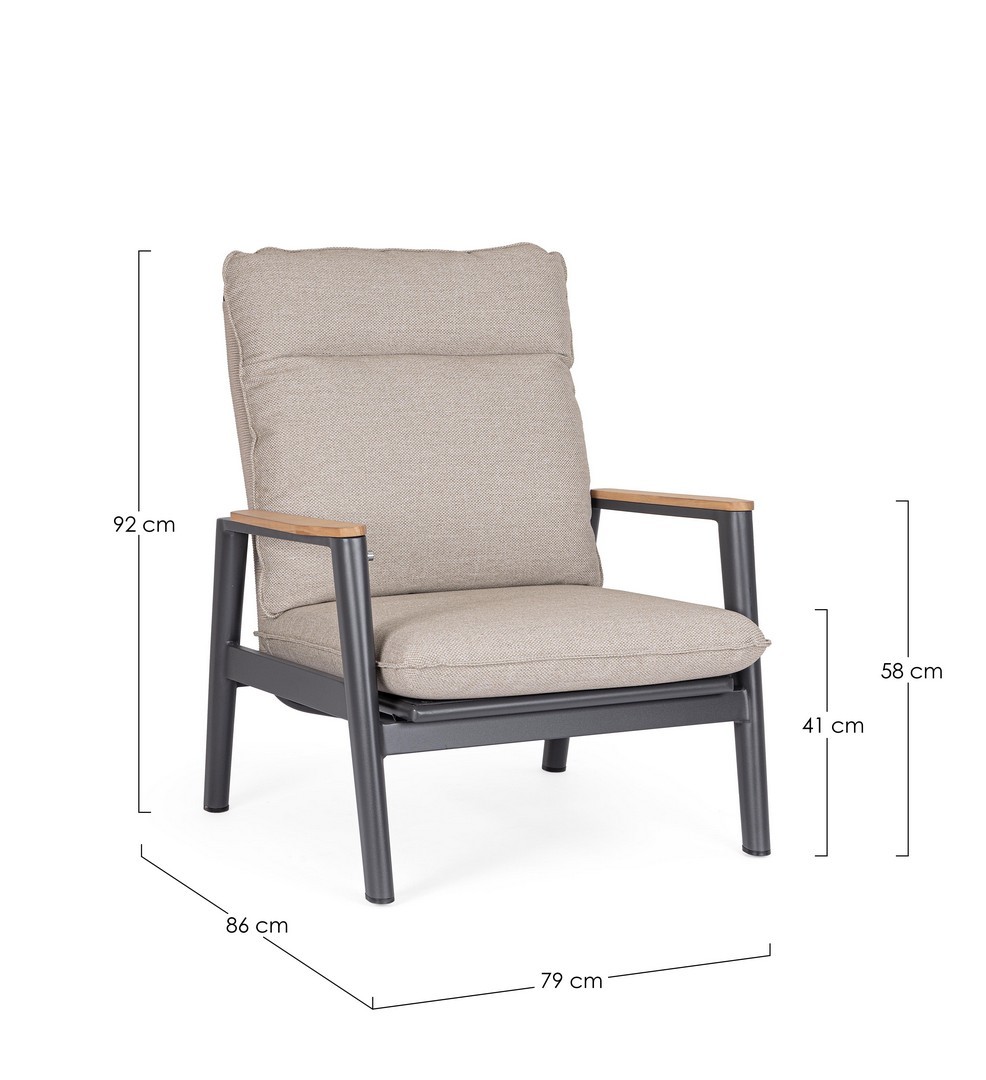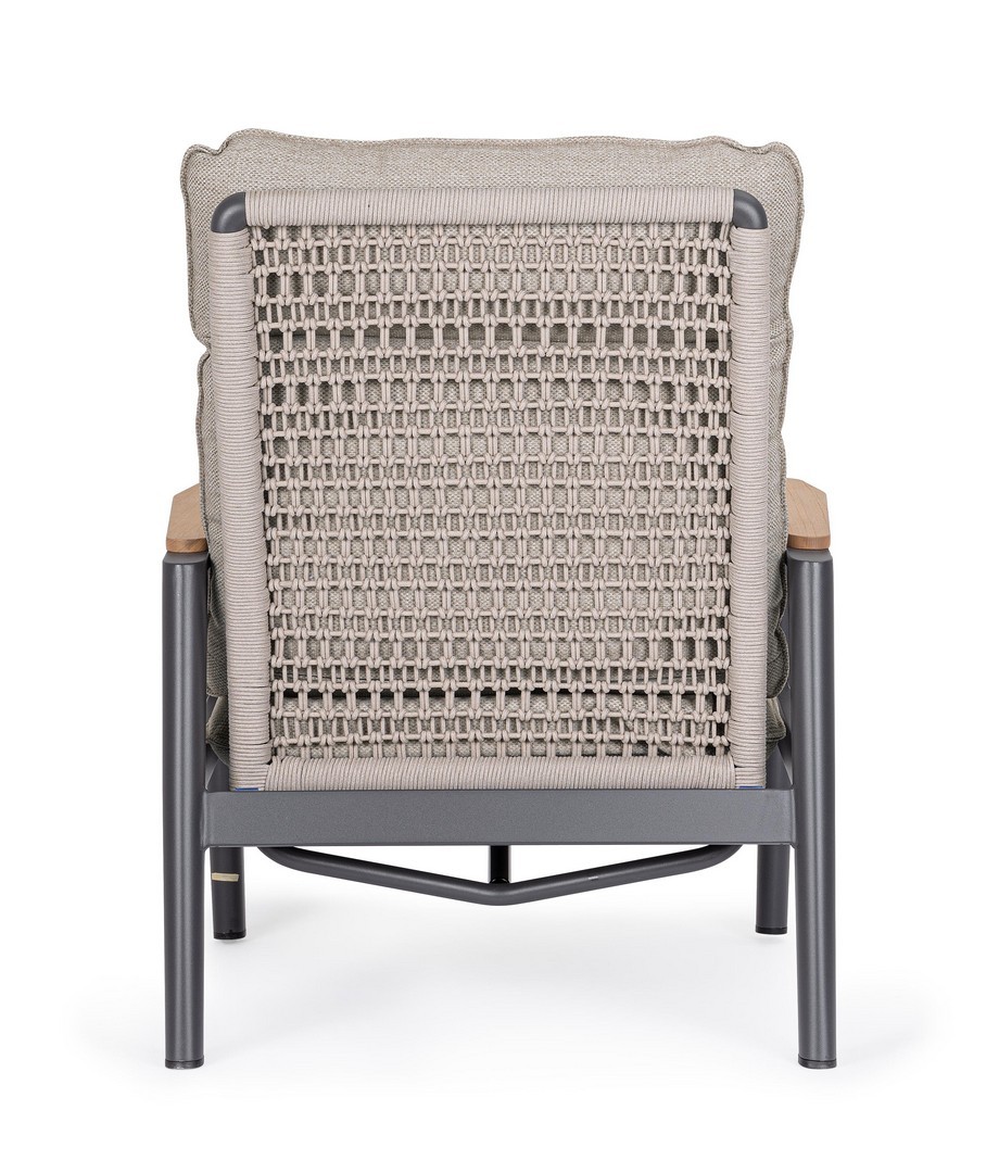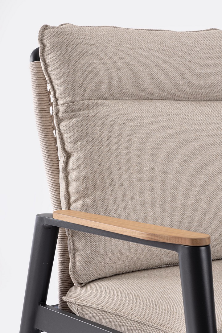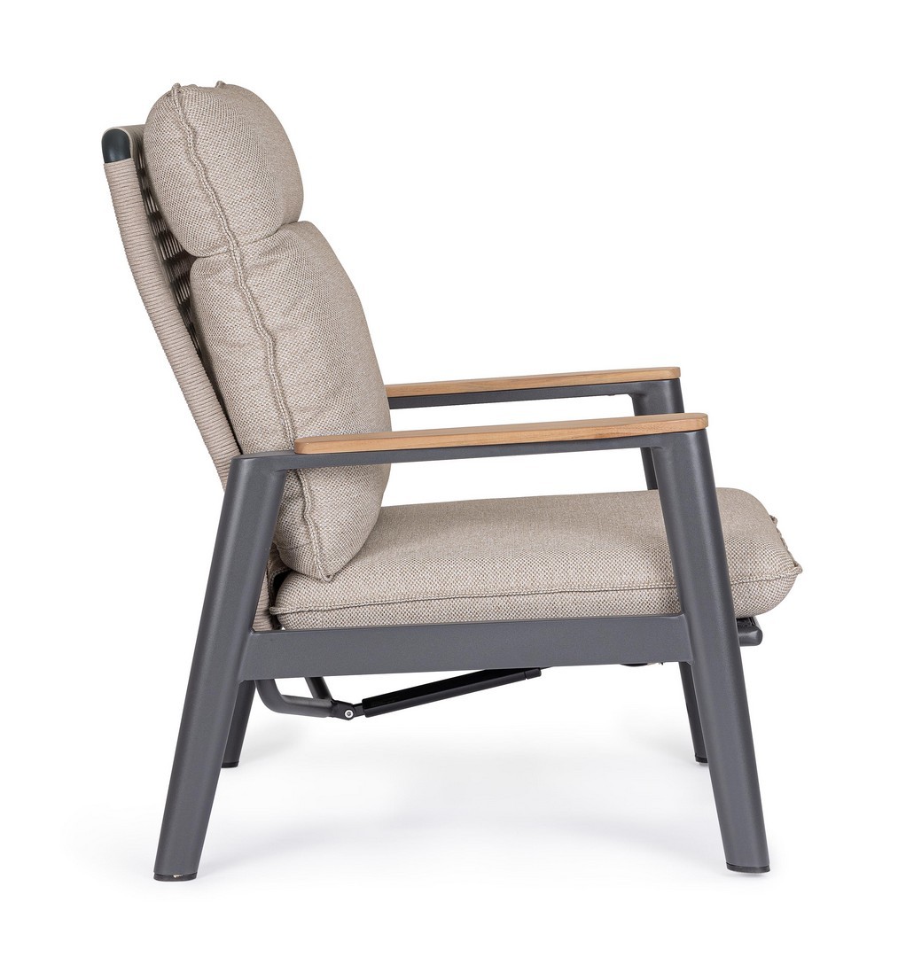 Konštrukcia z práškovaného hliníka (polyester). Lakťové opierky s teakovými vložkami. Operadlá (s pleteným olefínovým lanom), polohovateľné, sedacia časť z textilenu 1×1. Odnímateľné vankúše s poťahom z vodeodolnej olefínovej tkaniny (100 % polypropylén). Nerezové skrutky.