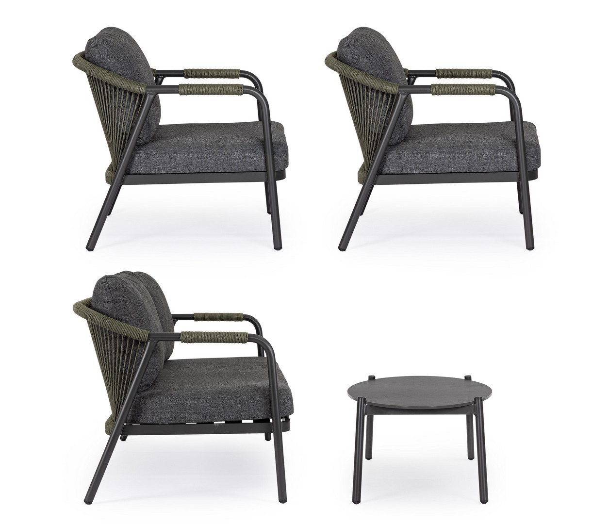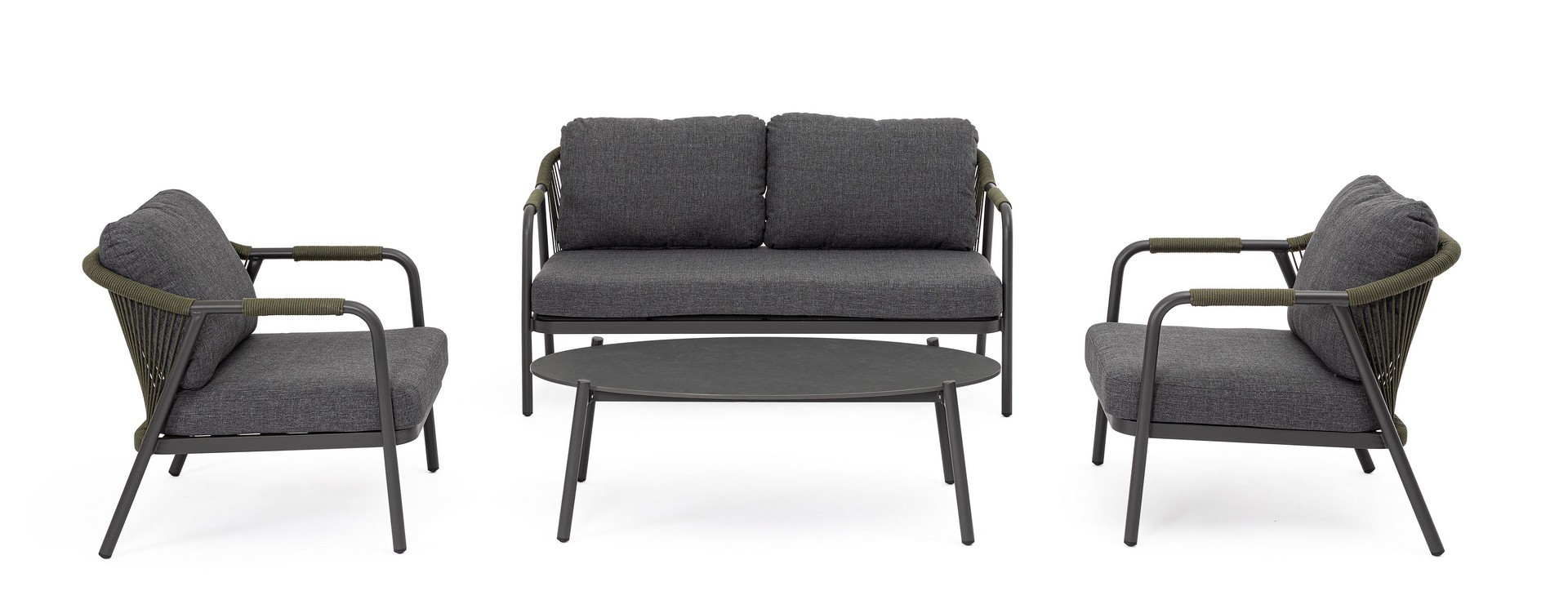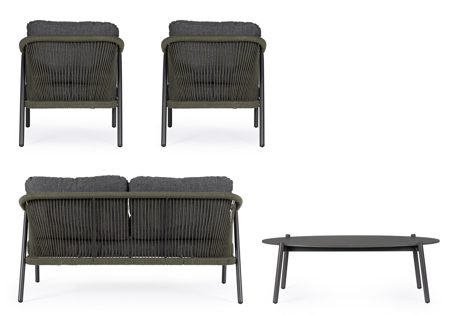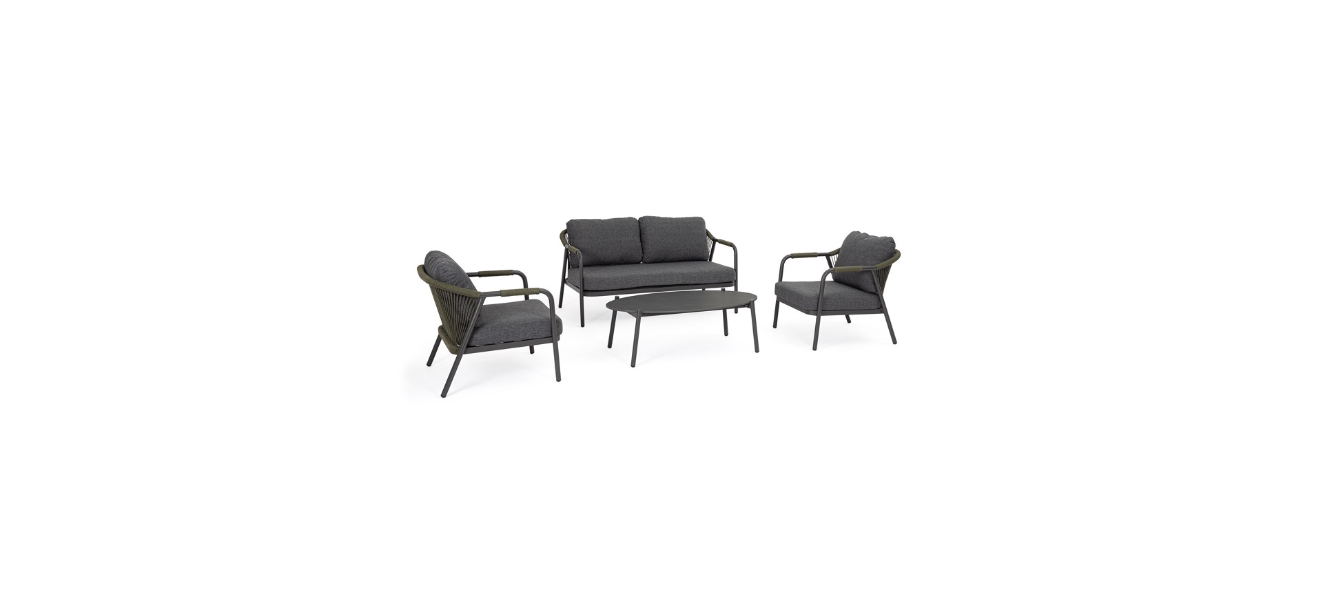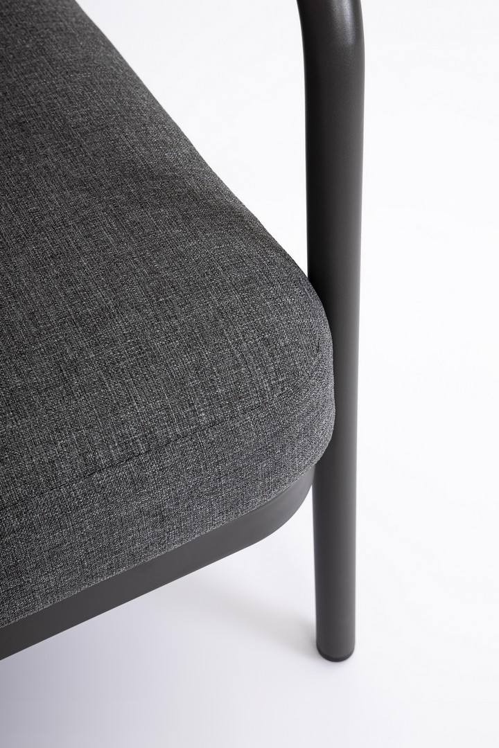Konštrukcia z práškovaného hliníka (polyester). Výplet na vonkajšie použitie z olefínového lana (polypropylén). Doska z spekaného kameňa (prírodný kameň upravený pri vysokých teplotách) s hrúbkou 11 mm. Odnímateľné vankúše s poťahom z vodeodolnej tkaniny (100 % polypropylén). Nerezové skrutky.