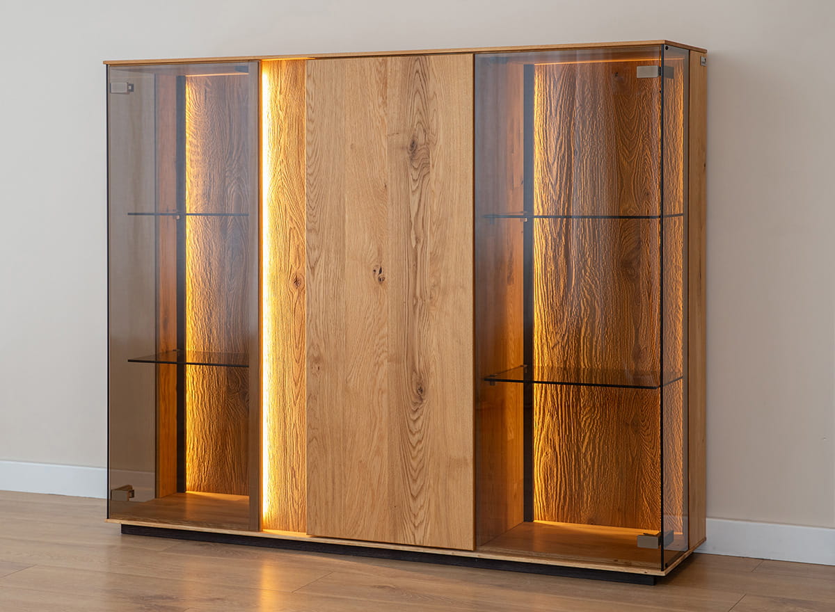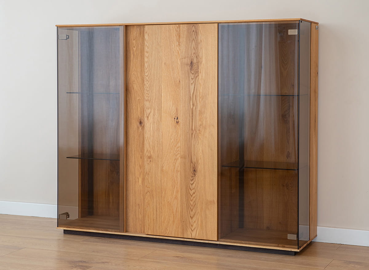 Pridať do sledovača cienKolekcia Collodi zaujme svojím prirodzeným pôvabom a moderným dizajnom. Nízka trojitá vitrína v zlatom odtieni olejovaného duba, zdobená viditeľnými krúžkami a súknami, pomáha vniesť do každého interiéru hrejivú, útulnú atmosféru. Stredná časť vitríny je vybavená plnými dvierkami, ktoré dodávajú nábytku elegantný charakter, zatiaľ čo pravá a ľavá časť sú presklené. Ich súčasťou sú aj sklenené police, ktoré dodávajú interiéru ľahkosť. Vďaka možnosti inštalácie dekoratívneho osvetlenia sa vitrína môže stať personalizovaným miestom na dekorácie. Tento kus nábytku je ideálny pre milovníkov moderného, škandinávskeho alebo klasického štýlu.