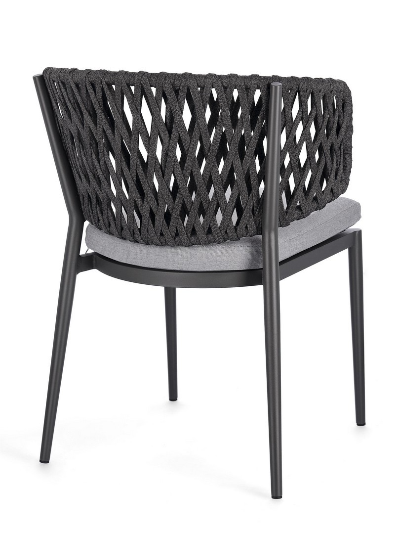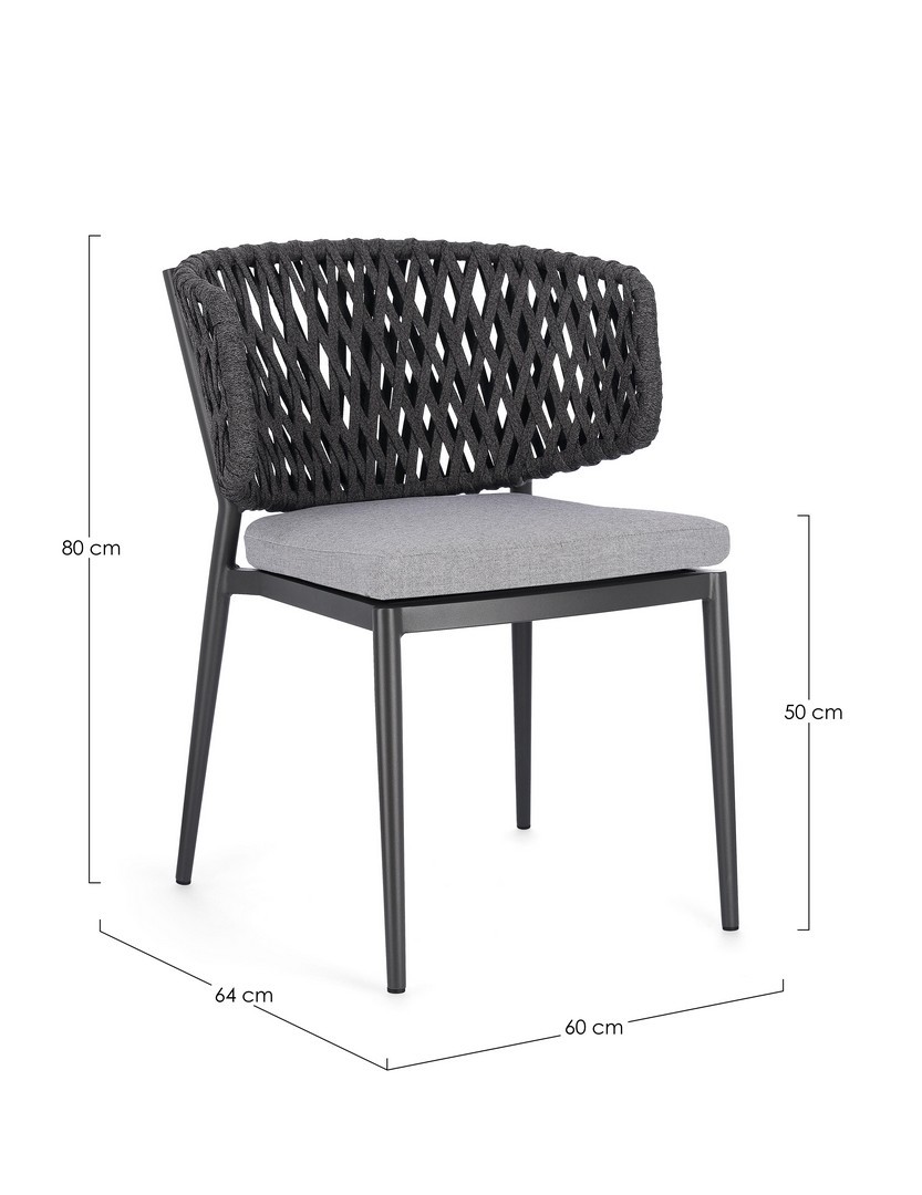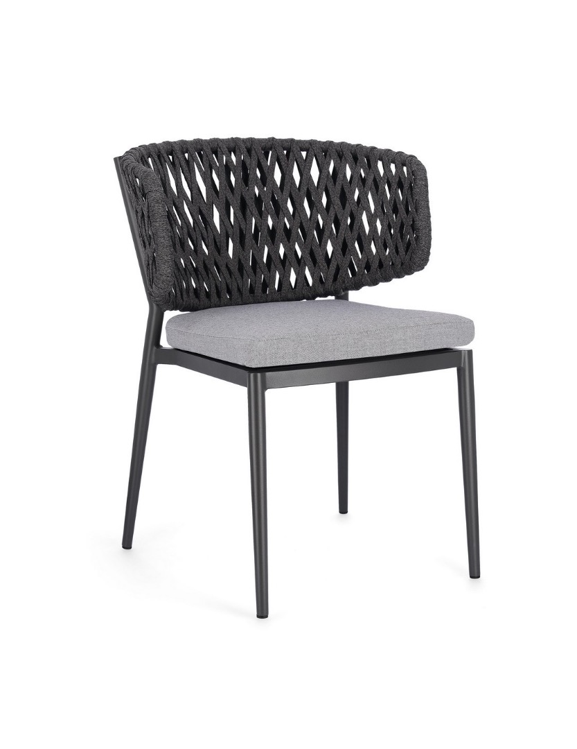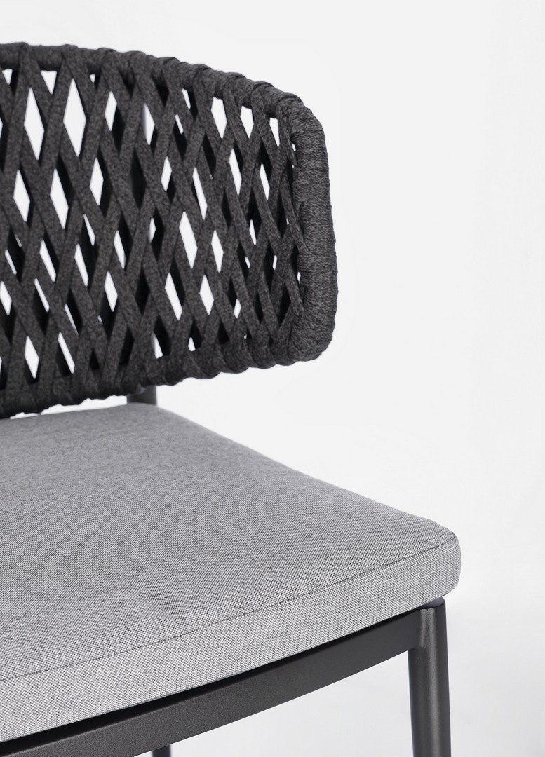 Hliníkový rám s práškovou povrchovou úpravou (polyester). Výplet z tetorónového lana (100 % polyester). Sedací vankúš s odnímateľným poťahom z vodoodpudivej akrylovej tkaniny.