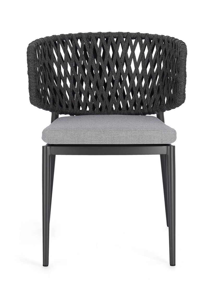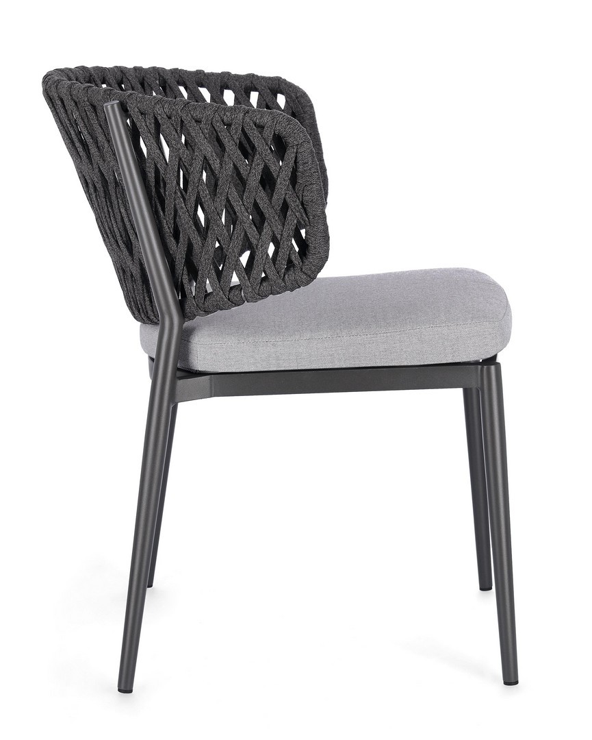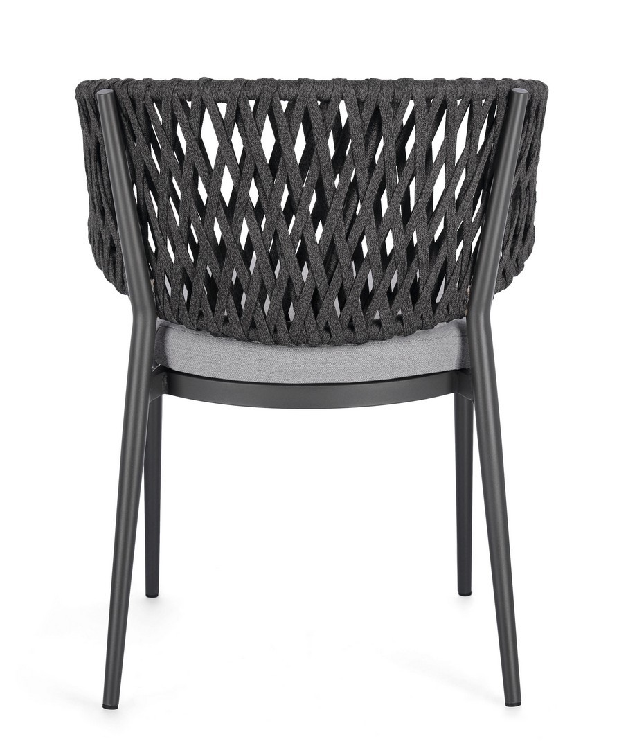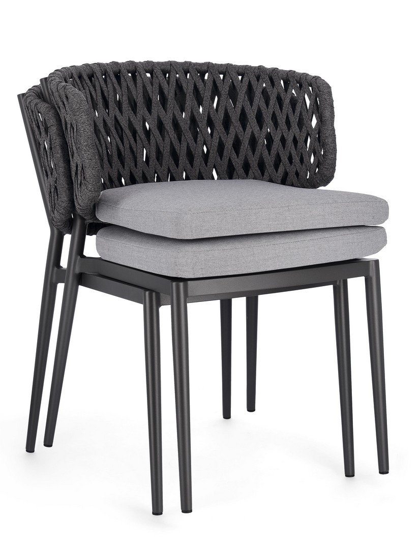 Hliníkový rám s práškovou povrchovou úpravou (polyester). Výplet z tetorónového lana (100 % polyester). Sedací vankúš s odnímateľným poťahom z vodoodpudivej akrylovej tkaniny.