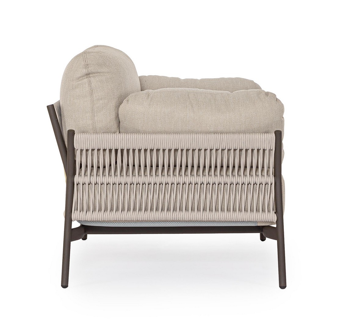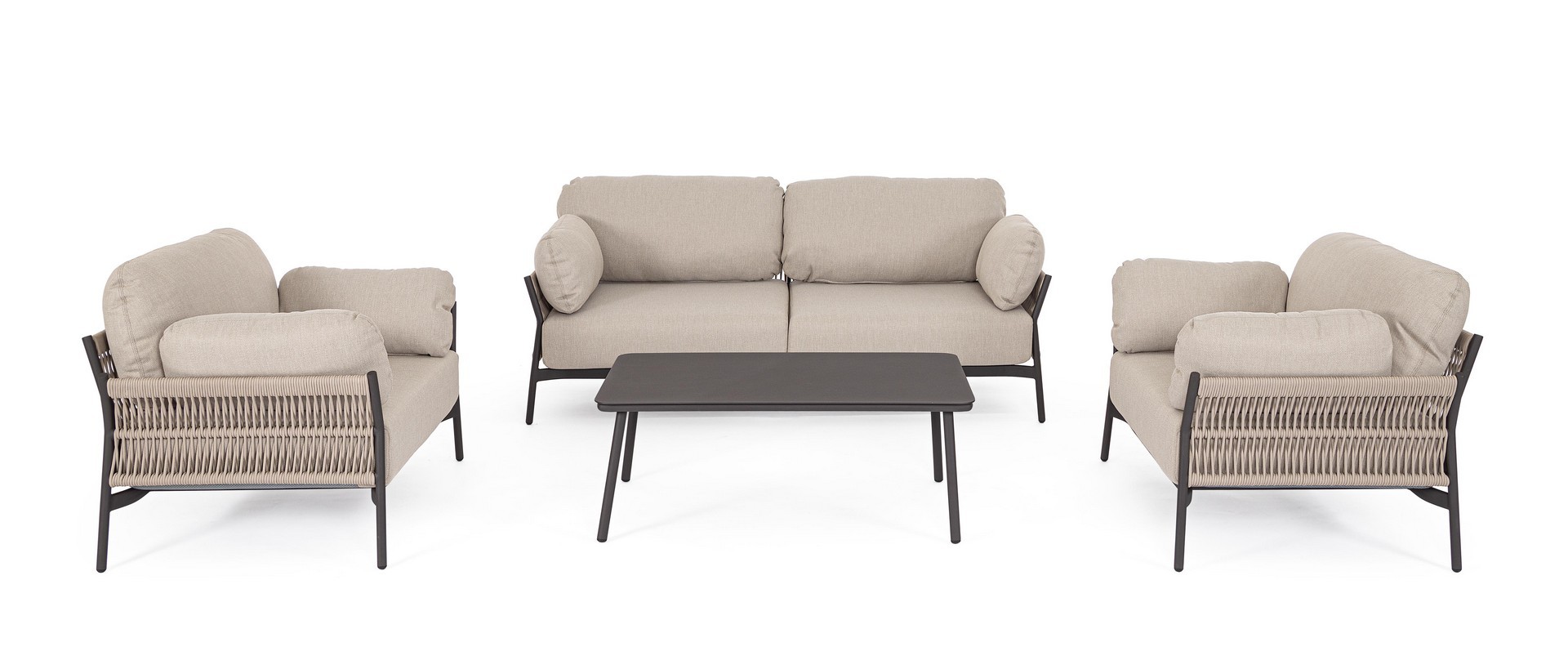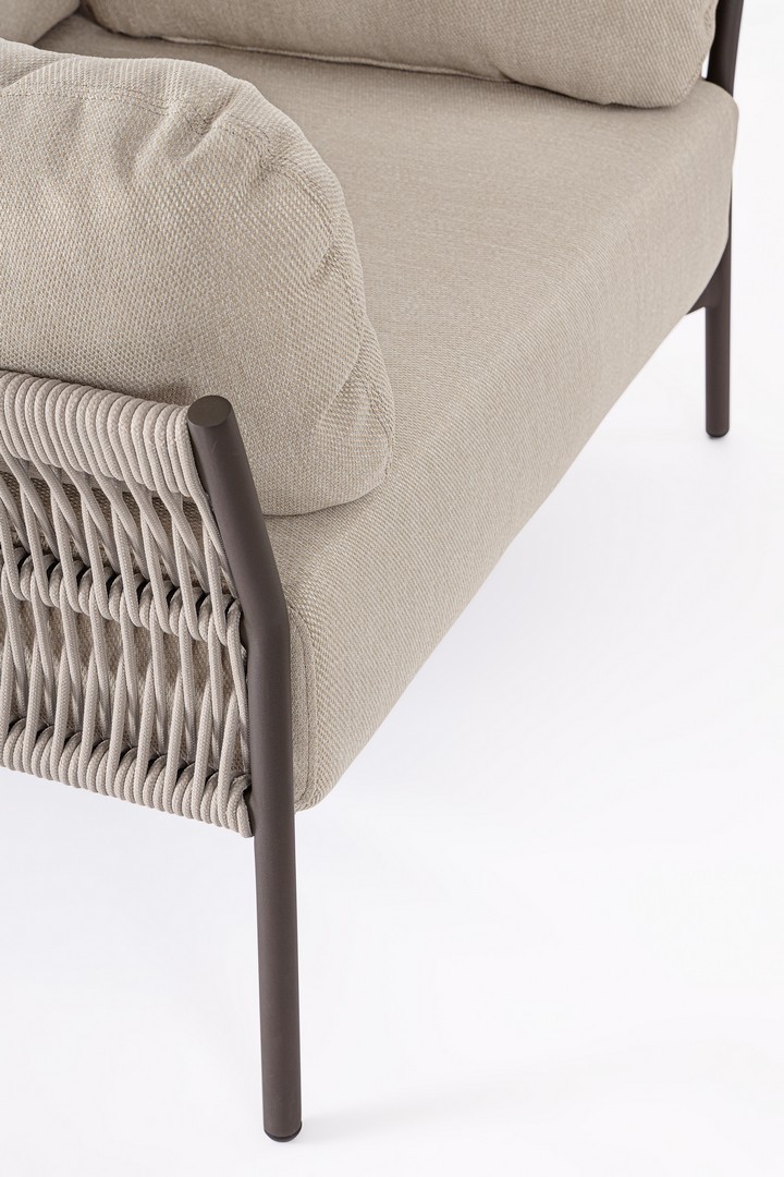 Hliníkový rám s práškovým nástrekom (polyester). Výplet z lana z olefínovej tkaniny (100 % polypropylén). Sedáky a operadlá s vankúšmi s odnímateľným poťahom z vodeodolnej olefínovej tkaniny (100 % polypropylén).