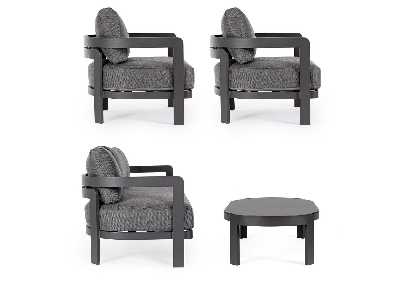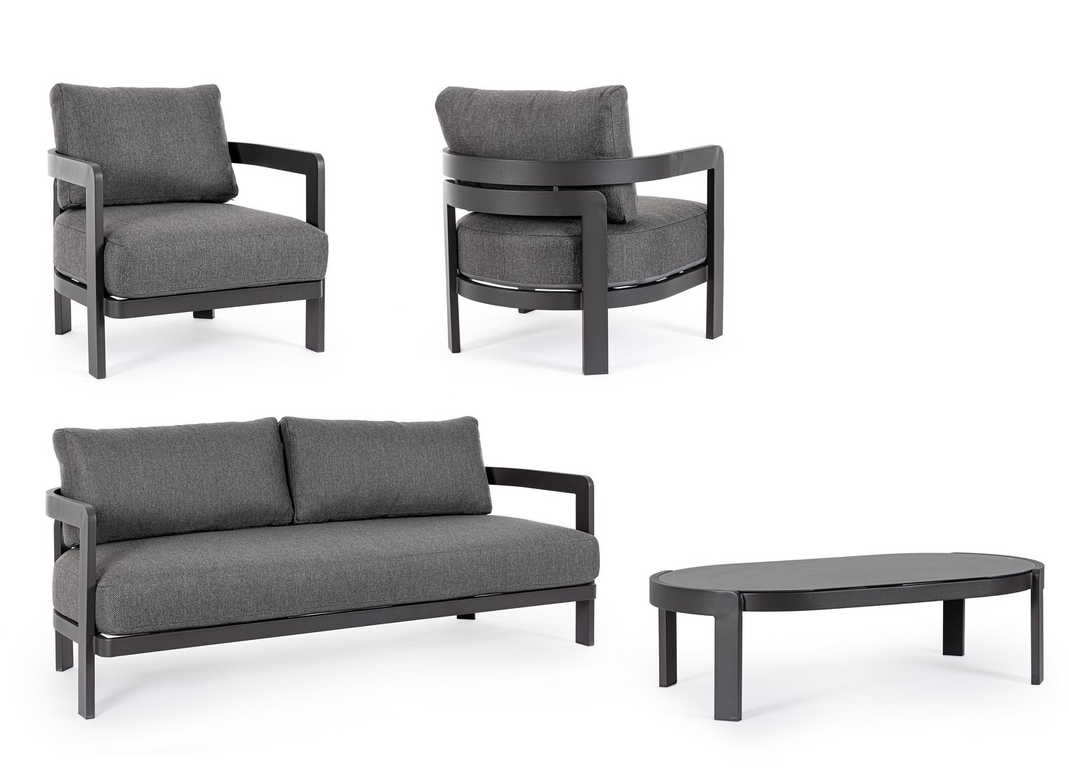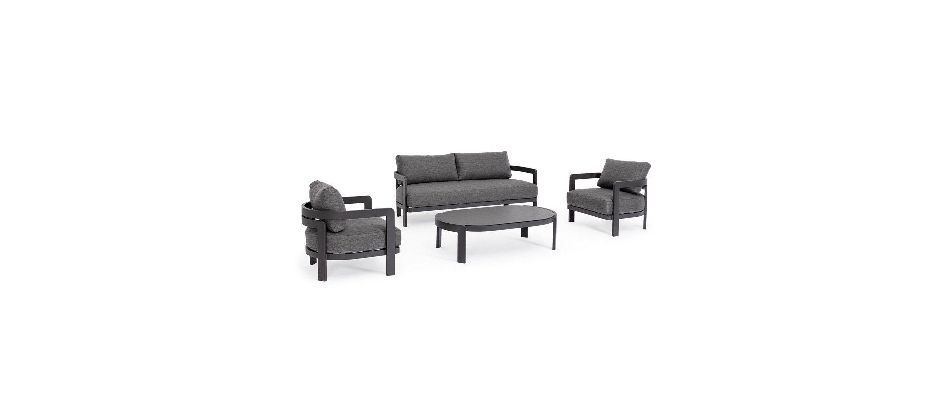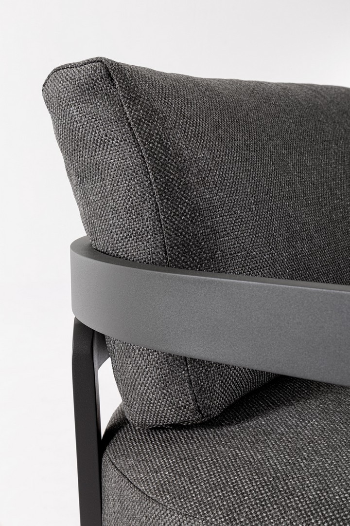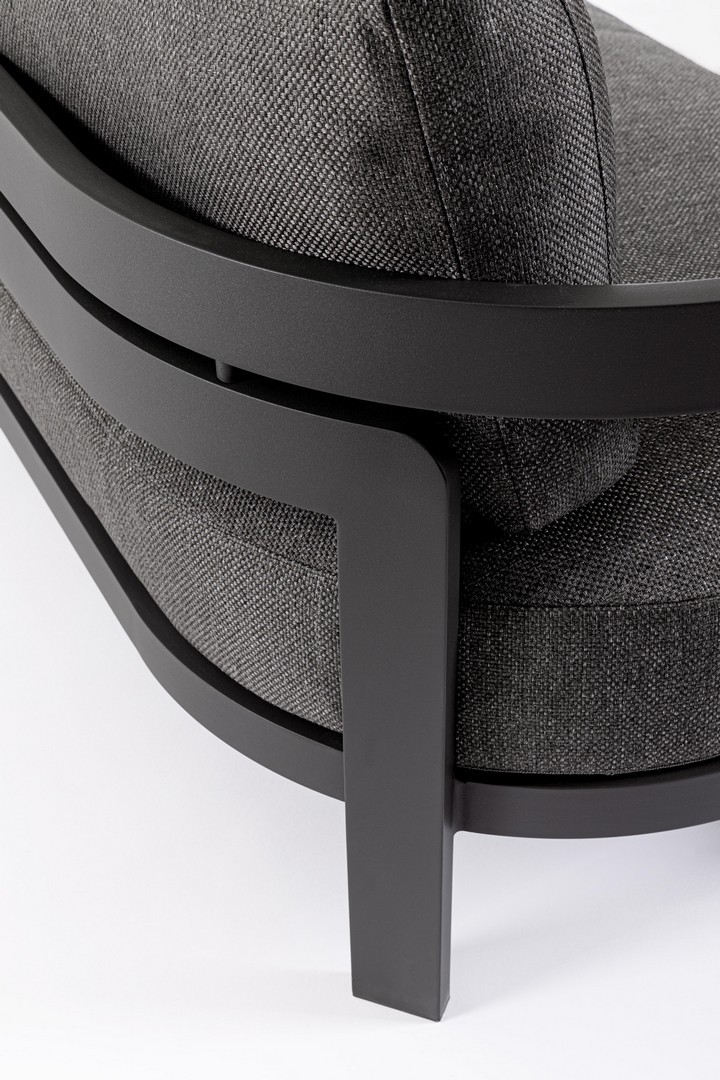 Hliníkový rám s práškovým nástrekom (polyester). Sedáky a operadlá s vankúšmi s odnímateľným poťahom z vodeodolnej olefínovej tkaniny (100 % polypropylén). Konferenčný stolík s potlačenou sklenenou doskou.