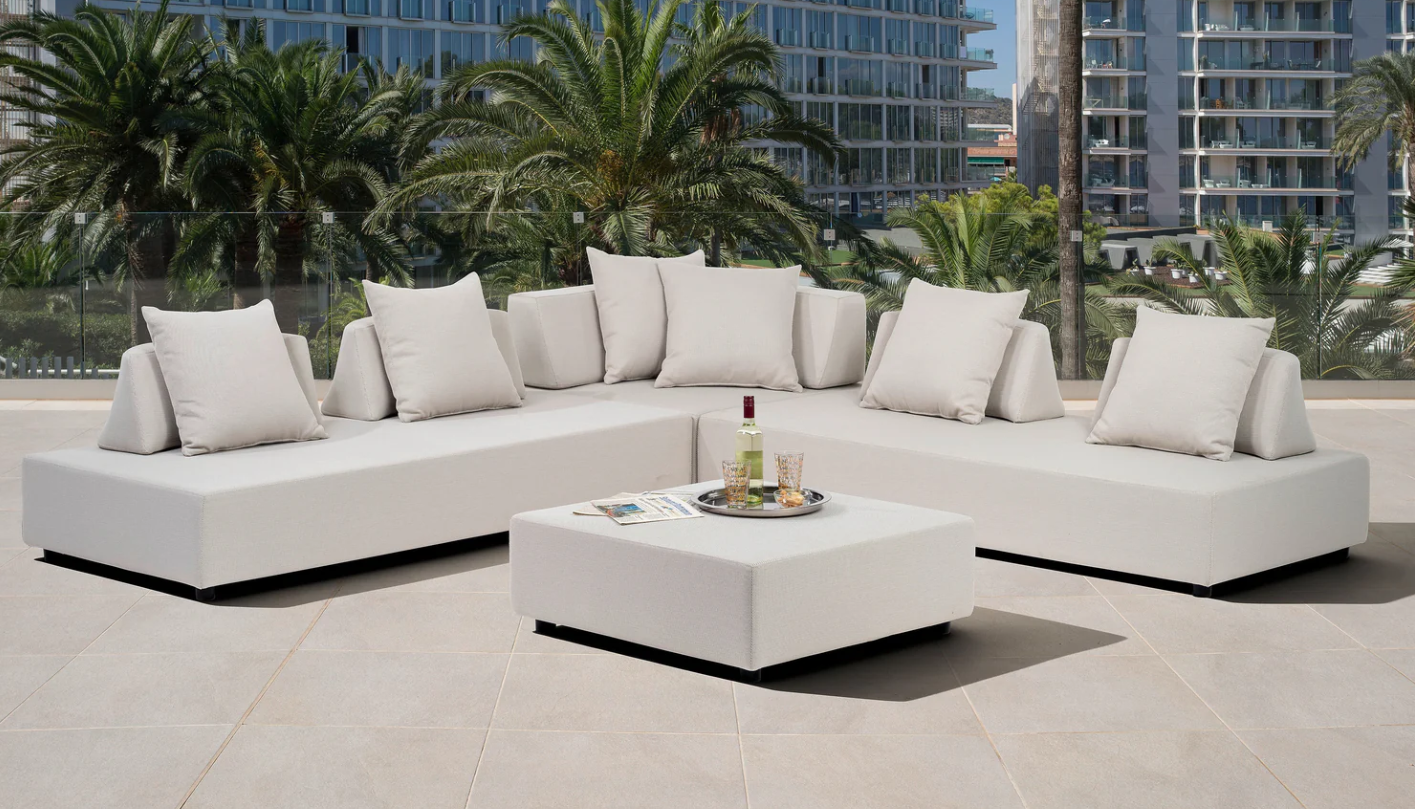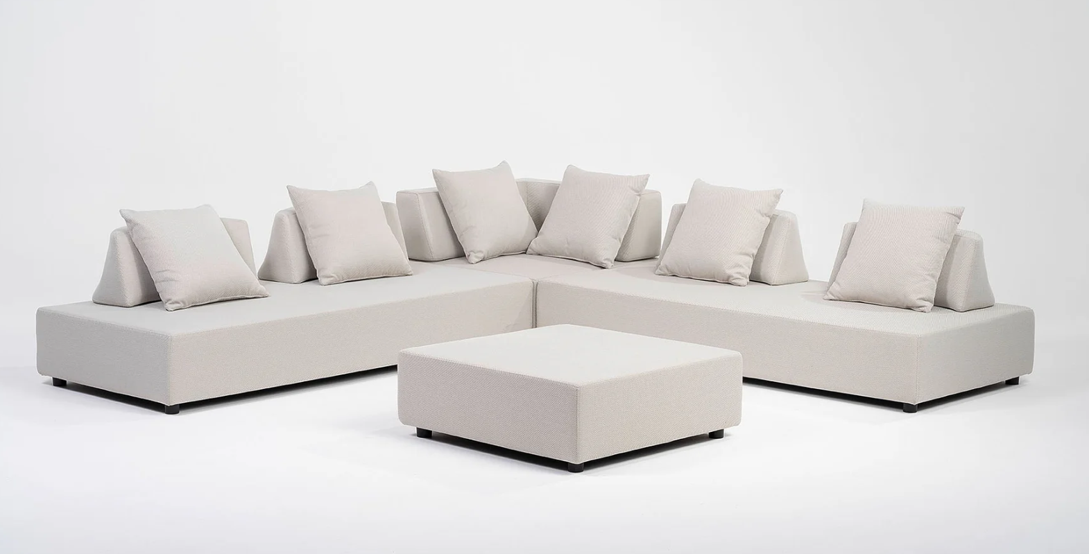 Hliníkový rám je ošetrený antracitovou práškovou farbou. Textilný poťah z tkaniny Axroma v krémovej farbe je odolný voči poveternostným vplyvom. Operadlá sa dajú posúvať alebo úplne odňať (vďaka integrovanej záťaži a protišmykovej základni sa nemôžu zošmyknúť). Odkladacia tácka na taburet je vyrobená výhradne z hliníka s antracitovým práškovým nástrekom.
