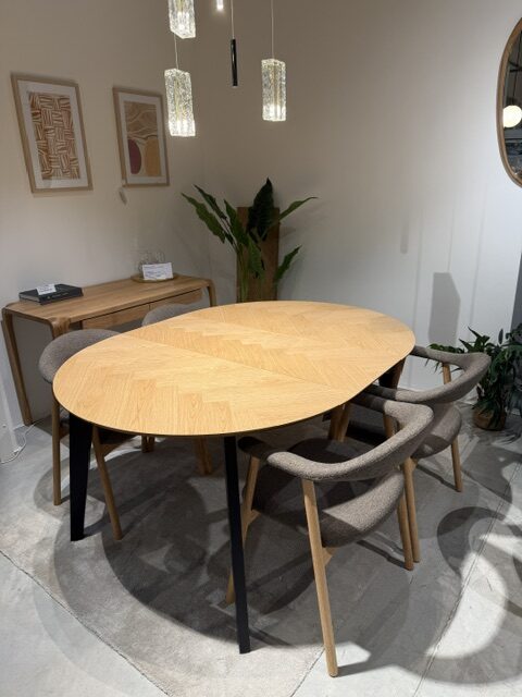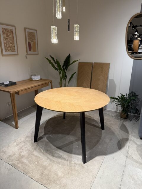 Pridať do sledovača cienJedálenský stôl, ktorý dokáže vdýchnuť vašej jedálni nový život vďaka znovuobjavenému vzoru rybej kosti. Okrúhly tvar šetrí miesto a vzor opticky zväčšuje povrch. Ak by to nestačilo, môžete vždy pripevniť 2 priložené predlžovacie dosky. A čierne drevené nohy? Tie dotvárajú moderný severský vzhľad.