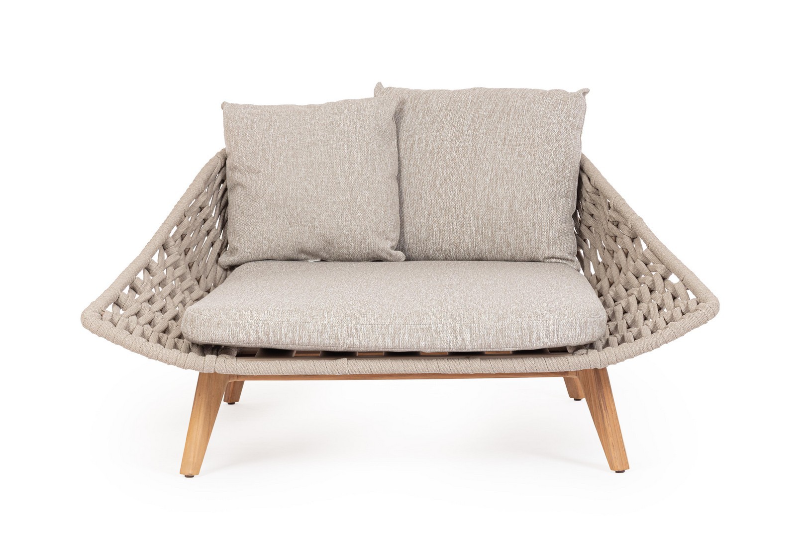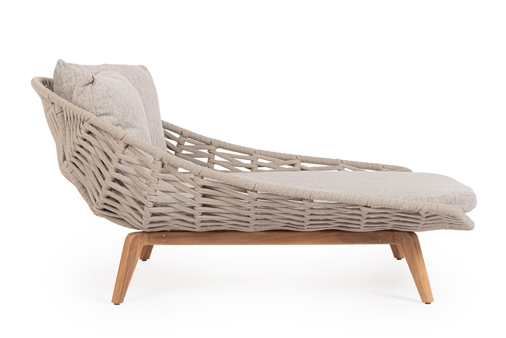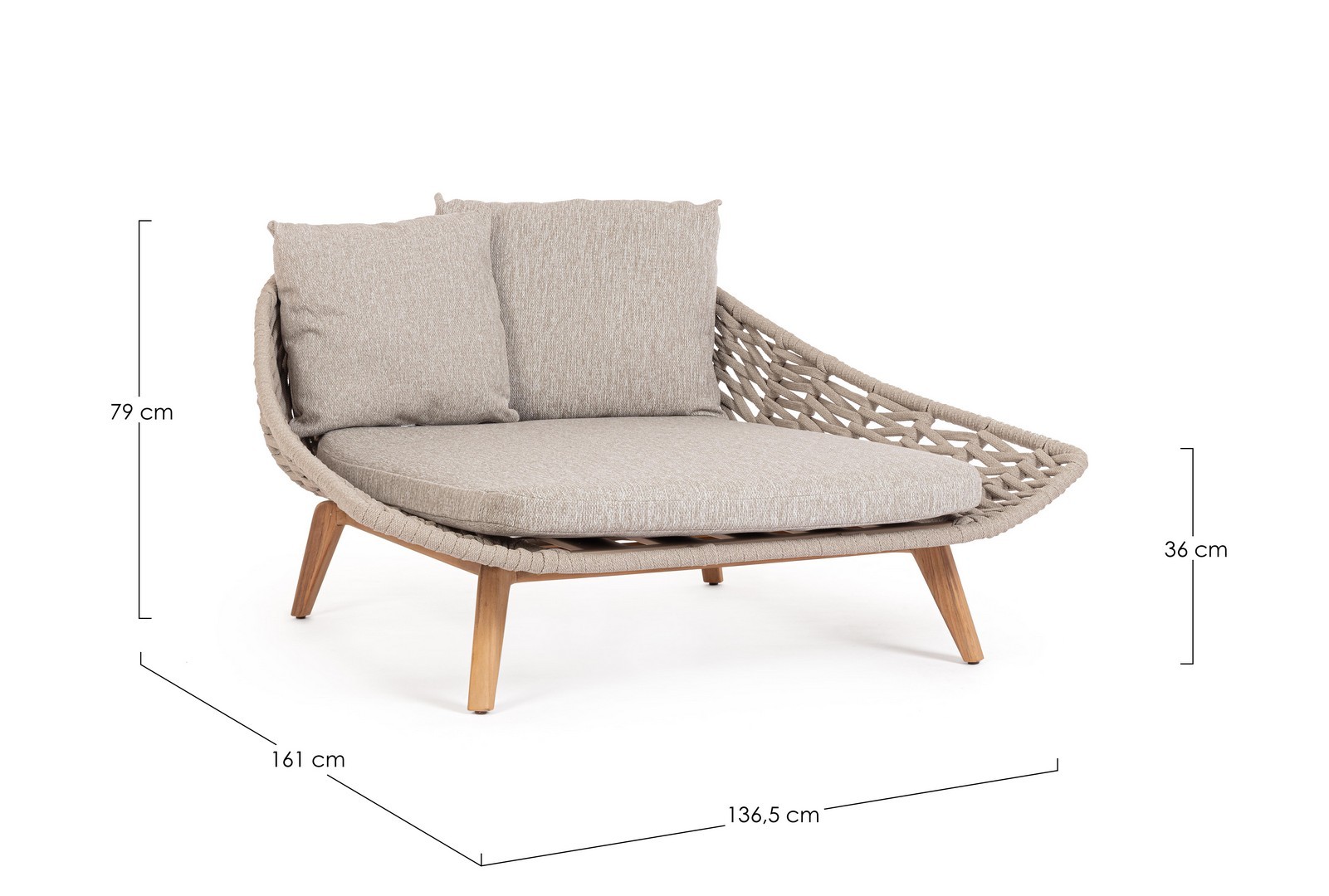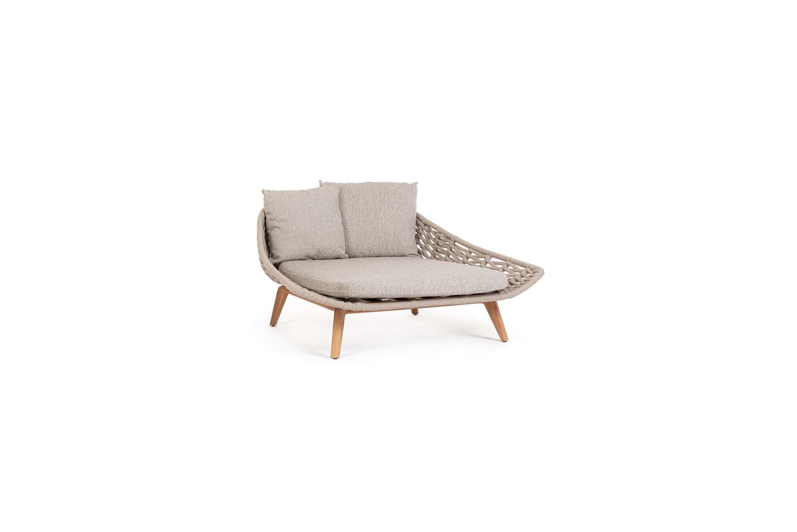 Hliníkový rám s práškovou polyesterovou povrchovou úpravou. Nohy z teakového dreva – SVLK (indonézske legálne drevo). Výplet na vonkajšie použitie z lana (polypropylén). Vankúš s odnímateľným poťahom z vodoodpudivej látky Sunproof Olefin (100 % polypropylén).