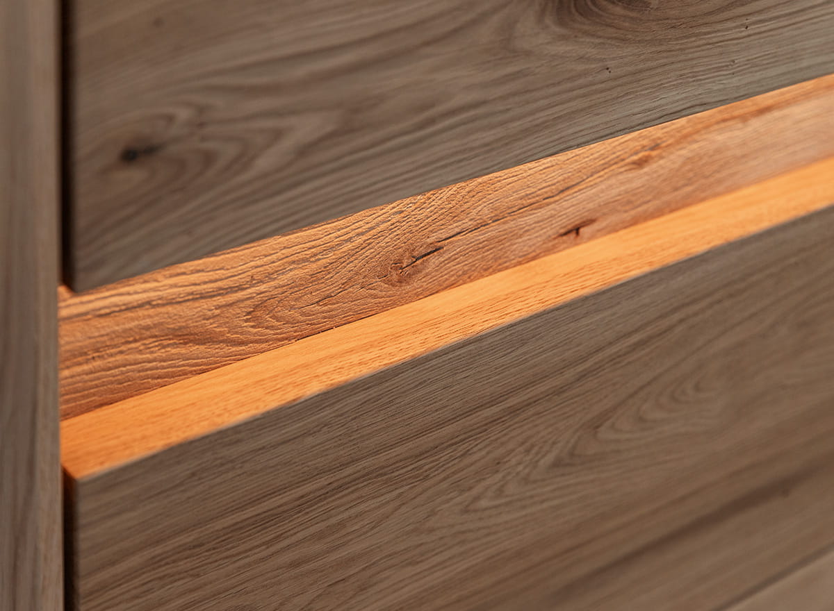 Okrem vysokej odolnosti a nezameniteľného štýlu sa drevená vitrína vyznačuje zlatistou farbou a viditeľnými vzormi a sukmi. Za všetky tieto vizuálne vlastnosti je zodpovedný proces olejovania, ktorému bol nábytok podrobený. Na druhej strane, výrazná kresba dreva na jednom z panelov je výsledkom kartáčovania. A to nie je všetko! Drevená skrinka je štandardne vybavená vnútorným osvetlením a systémom tichého zatvárania, vďaka čomu je jej používanie ešte pohodlnejšie.