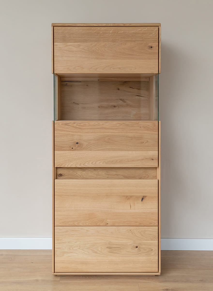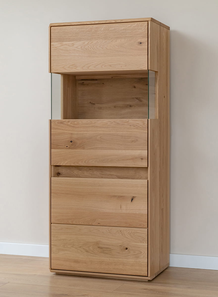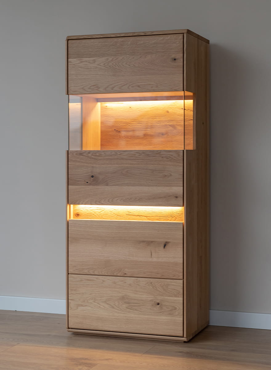 Drevený nábytok je zárukou kvality, trvanlivosti a pevnosti, o to viac, ak sa na jeho výrobu použil prírodný dub, ktorý patrí k najtvrdším druhom. Okrem technických vlastností je to aj krásny materiál, zdobený uzlami a sukmi, ktoré sa tiahnu po jeho povrchu. Namiesto ich maskovania je vhodné ich zvýrazniť. Dubová vitrína prešla procesom olejovania, ktorý jej dodal zlatistú farbu a zvýraznil prirodzenú štruktúru dreva.
